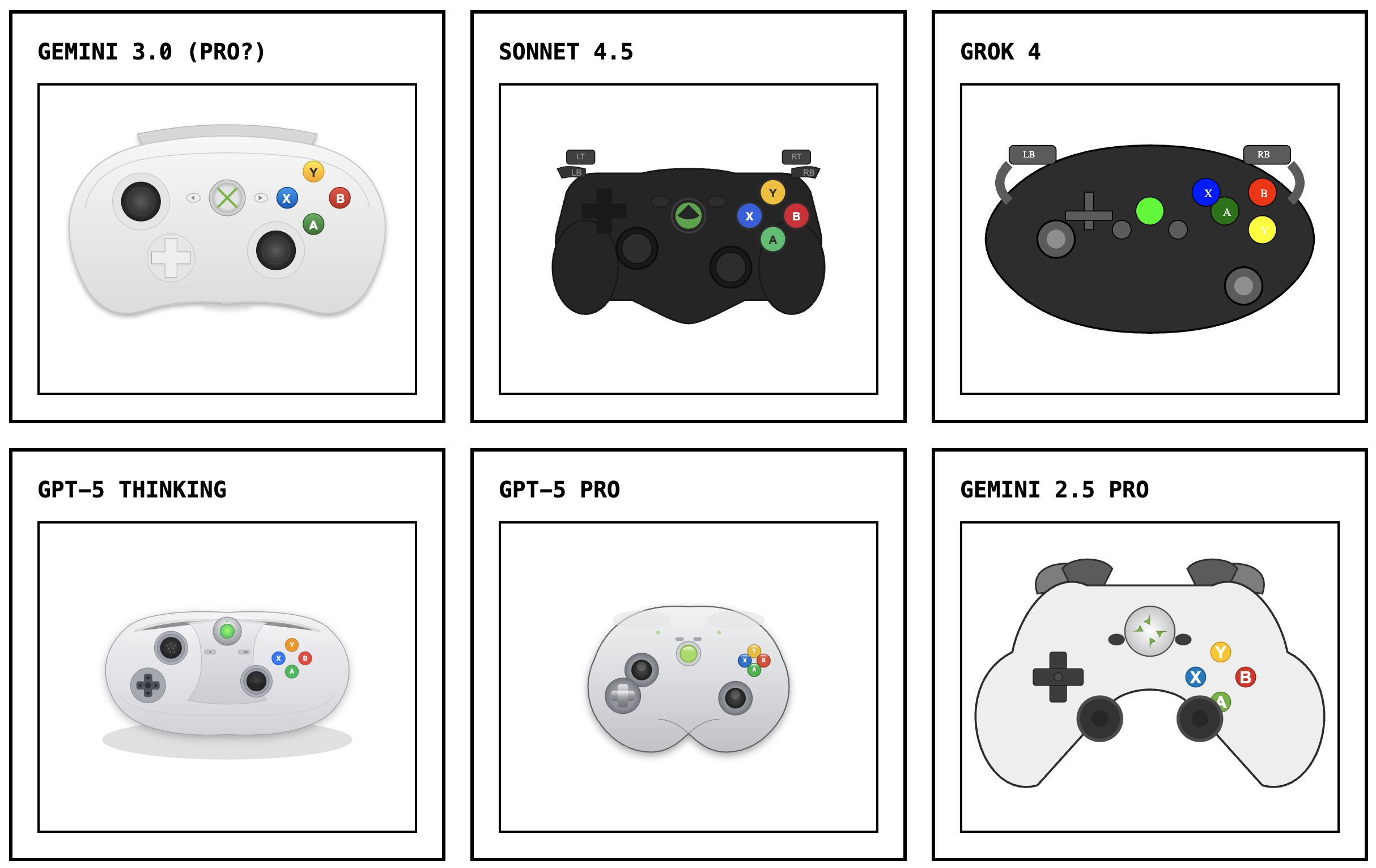 疑似Gemini 3.0生成的 Xbox 360 手柄的 SVG 图像,对比其他AI生成的
