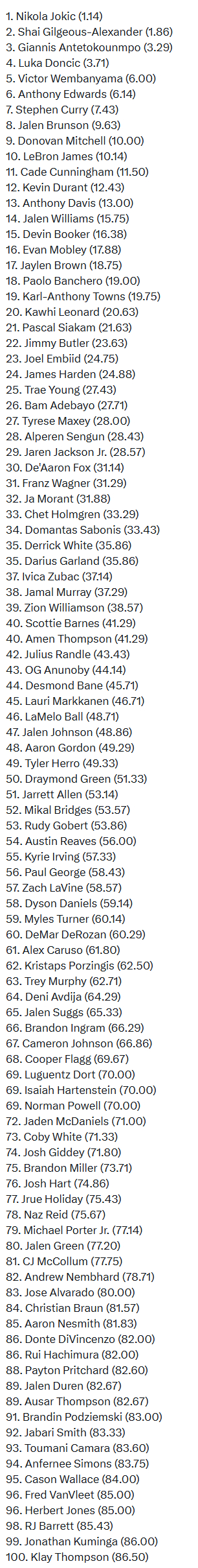 综合美八大媒体新赛季球员平均排名前100: