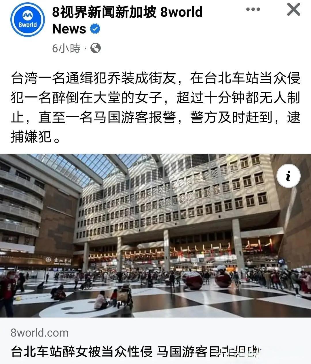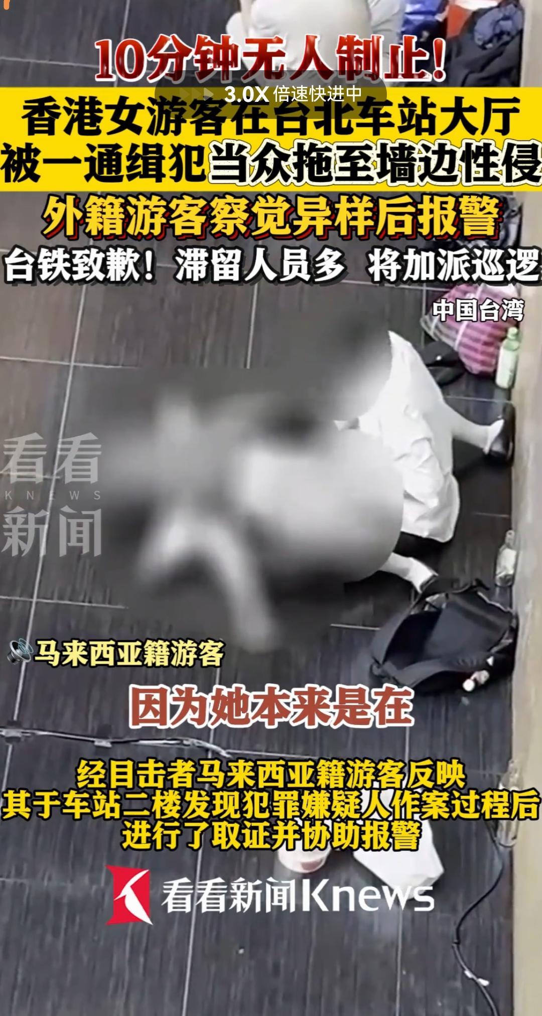 香港女游客在台北地铁被性侵十分钟无人阻止后续,嫌疑人是通缉犯,目击者告诉更多 近日一则香港女游客在台公共场合性侵十分钟无人阻拦的视频被各大媒体传得沸沸扬扬。 据最新传来消息,这起公共场合性侵案是发生在10月9日,为什么时隔将近一个星期才被国外的一些媒体曝光后才传到国内?这个原因很简单,就是台当局捂不住了!这种被上升到社会重大舆论的事,当当局的一惯作风就是先捂着,捂不住了再说。 据媒体深挖报道,台湾一名通缉犯邱某明乔装成街友,通过朋友与来台旅游的香港女游客认识,并在9日在车站内吃饭饮酒,而所饮的酒竟然是58度的高度白酒,饮完三瓶白酒后,香港女游客就因为不胜酒力出现了醉酒状态,而同行的其他人都借故离开,留下通缉犯邱某明一个人照顾醉酒的香港女游客。 看到醉酒倒下的香港女游客,通缉犯邱某明不知道怎么想的就把她扶到一角落就对她进行侮辱性动作,而当时在车站上人来人往却没有一个人出来阻止,最后在十分钟后被一名马来西亚的游客发现这一让人无比气愤的一幕,他于是便拿出手机进行拍摄取证,一边通知朋友过来帮忙,同时报了警。 很快台湾警察来了就把性侵的通缉犯邱某明给控制住,原来通缉犯邱某明44岁,是个有多盗窃案底前科的惯犯,为逃避刑责装成街友四处游走。 如今,邱某明已经被当局送进监狱,而香港女游客完成口供后离开了台湾。 据现场目击者称,事发当时,性侵者邱某明先是在大庭对倒地的香港女游客进行侮辱,然后才把她拖到墙角进行犯罪行为。 而事件发生后,台当局在舆论的谴责下作出的回应是:加强当地的巡逻和在必要的地方竖起“禁止饮酒、躺卧和抽烟”等警示牌。对事件的表态是:“备感遗憾和难过”。