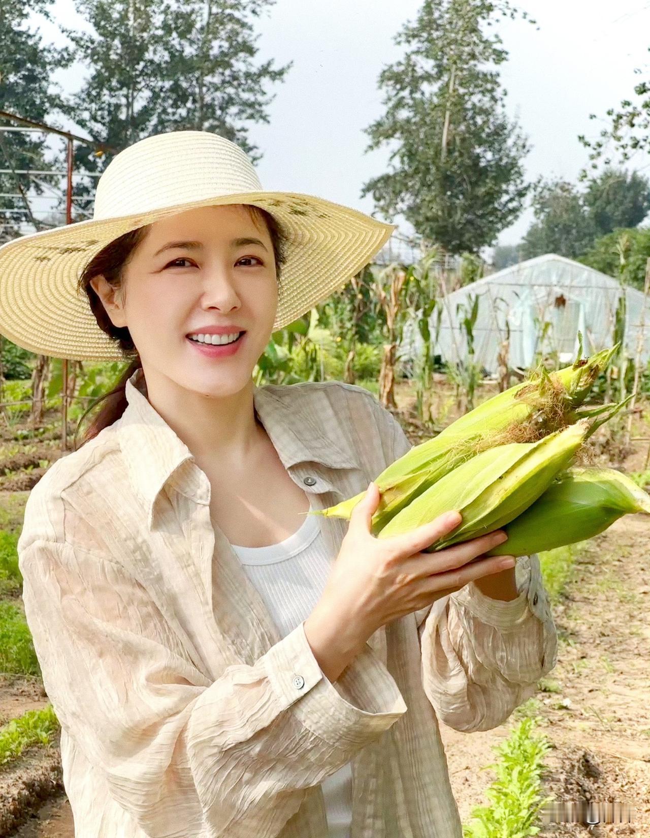 曾黎.手捧玉米体验田园生活,美人就是美人怎么打扮怎么美。