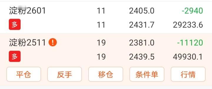 主力意图太过明显,近期合约表现远逊于远期合约,摆明了不让我移仓换月。 对于玉米淀粉期货,我坚定看多远期合约。可2511合约临近交割日,我便打算移仓至2601合约。然而主力心怀叵测,抓住散户这一心理,持续打压2511合约,使其较2601合约贴水20多点。若要移仓,就得承受1%左右的损失。