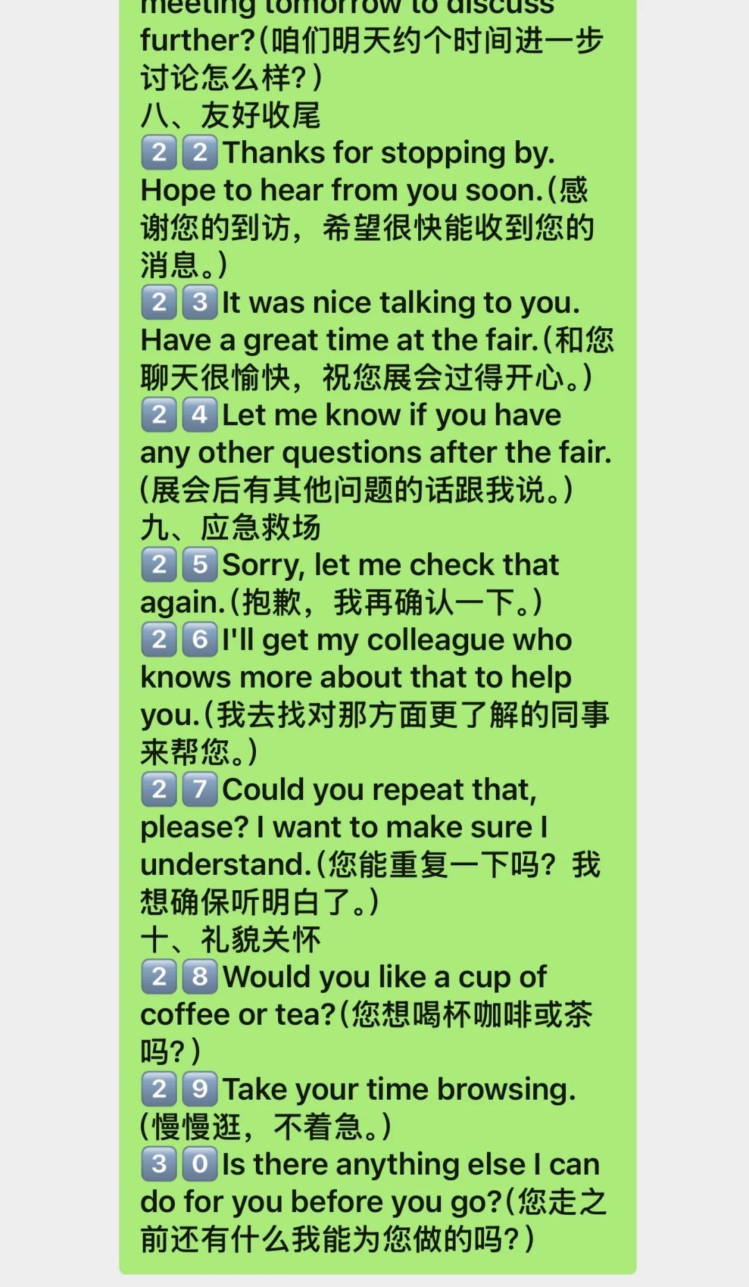 别慌!专门整理了超适配的 30 句接待速成话术,从见面破冰到谈单留联,再到礼貌收尾,全是展会高频场景能用的,不用费脑瞎琢磨,记熟就能直接用~