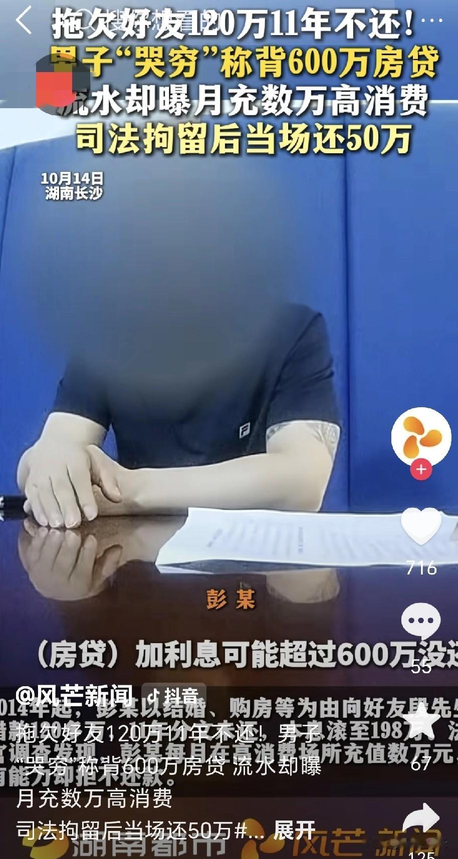 湖南长沙,一男子好友结婚,借了男子120万元,谁知11年过去,好友1分不还,男子一算,连本带息已经滚到198万,男子告到法院,好友哭穷,说他背着600万房贷,法院一查流水,发现好友挥金如土,给车贴膜花29800元,水果店充值5000元,台球厅每月消费3千~5千,足浴馆充值10000元,如今他还想赖账,法院将他往拘留所押送,好友傻眼,当场先还了50万,结果亮了! 段先生家境殷实,为人宽厚,对待朋友,更是以心相待,他为人义气,义薄云天,朋友只要张口求助,他绝对不会袖手旁观。 段先生有个好友彭某,俩人一直相处的很好,时间一长,彭某逐渐摸清楚了段先生的脾气。 2014年的时候,彭某来到段先生家里,他说自己要结婚买房,要问段先生借120万元。 他说的悲伤可怜,如果没房,女方就不会嫁他,他就要孤苦伶仃,没办法再生活下去。 段先生没有多想,好友结婚买房,这是人生大事,万万不能耽搁,再说,俩人好友多年,自己手里有钱,不帮朋友说不过去。 彭某口头做出了承诺,他就最多使用两年,到时候他会连本带息归还,绝对不会辜负段先生对他救急的心意。 段先生看他着急,毫不犹豫给了他120万元,彭某心满意足,揣着钱急匆匆离开。 谁知两年之后,彭某压根不提还钱,他表面坦然,看起来好像没这回事。 段先生有些着急,毕竟120万不是个小数,这笔钱又不是风刮来的,也是他辛辛苦苦靠自己挣的。 段先生提醒彭某,两年已到,到了你承诺还钱的时候,彭某满口答应,就是不见还钱的行动。 在这期间,段先生催促过他几次,彭某开始还表面敷衍,之后段先生要的回数一多,彭某干脆就避而不见。 转眼间过去三年,五年,彭某依旧不肯还钱,段先生催的自己都烦了。 段先生开始心想,也许对方真的有什么难处,暂时还不上这笔钱,如果逼的太紧,又怕彭某会出事情。 段先生厚道,一心还为彭某着想,毕竟是多年的好友,段先生相信对方,他只要有钱,肯定就会立刻还钱。 这样一拖,就拖了11年,段先生不断的要钱,可是对方就不还钱。 很快段先生就发现,彭某的生活并不是像他说的那样困难,彭某生活奢靡,在朋友圈里大家都有耳闻。 段先生有些生气了,既然你已经经济上宽裕,你有了钱,肯定就要先还欠款。 你不能自己享受,借钱的成了大爷,帮助你的人,借给你钱的人却成了孙子? 段先生又一次问彭某要钱,彭某干脆消失不见,段先生电话他也不接,躲了起来。 到了今年,段先生算了一下本息,彭某借120万,11年的时间,连本带息已经滚到了198万。 段先生彻底恼了,一纸诉状告到了法院,法院向彭某发出通告,彭某不得不来到了法院。 到了法院,他又开始哭穷,说他背了房贷,连本带息欠银行600万元,他挣得钱一直都在还债,他压力太大,没有能力给段先生还钱。 可是鉴于他之前的老赖,段先生再也不相信他的表演,果然法院一查他的V信流水,他的消费,令法官也大吃一惊! 他给自己的汽车贴膜,毫不手软,光贴膜花了29800万! 法官问他: 你愿意花29800元去贴膜,你都不肯给段先生还钱? 之后法官发现,彭某在水果店充值5000元,在台球厅每月消费3000元~5000元。 他在足浴馆更是一掷万金,直接充值了10000元…… 他挥金如土,生活奢靡,只顾自己享乐,压根就没想过要给段先生还钱! 这种老赖,坑不到别人,利用朋友情谊,利用了段先生对他多年的信任。 这种人到了法院,还在试图抵赖,拒不还钱,法院决定,将他送往拘留所看管。 谁知彭某这时才知道了法律的威严,他在被送往拘留所的路上才低下了脑袋。 他承诺当场支付段先生50万元,尾款每月支付30万元,直至全部还清为止。 欠债还钱,天经地义,有些人就是不知天高地厚,以为只要自己足够老赖,法律就拿他没有办法。 殊不知天网恢恢疏而不漏,不要走到最后,钱也得还,朋友也没了,最终把自己活成了个笑话! 《民法典》第188条规定:向法院请求保护民事权利的诉讼时效期间为三年。法律另有规定的,依照其规定。 诉讼时效期间,自权利人知道或者应当知道权利受到损害以及义务人之日起计算。法律另有规定的,依照其规定。 但是,自权利受到损害之日起超过二十年的,法院不予保护,有特殊情况的,法院可以根据权利人的申请决定延长。 段先生在借款后的11年才向法院起诉,需要确认是否存在诉讼时效中断的情形,如是否有过催款行为导致时效重新计算。 《刑法》第313条规定:对法院的判决、裁定有能力执行而拒不执行,情节严重的,处三年以下有期徒刑、拘役或者罚金;情节特别严重的,处三年以上七年以下有期徒刑,并处罚金。 彭某有能力偿还债务却拒不执行,法院可根据其情节轻重追究其刑事责任。 最终彭某承诺,当场支付段先生50万元,尾款每月支付30万元,直至全部还清全部欠款及利息。 关注@王哥说法 多学法律少吃亏!