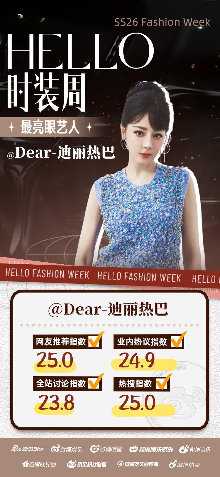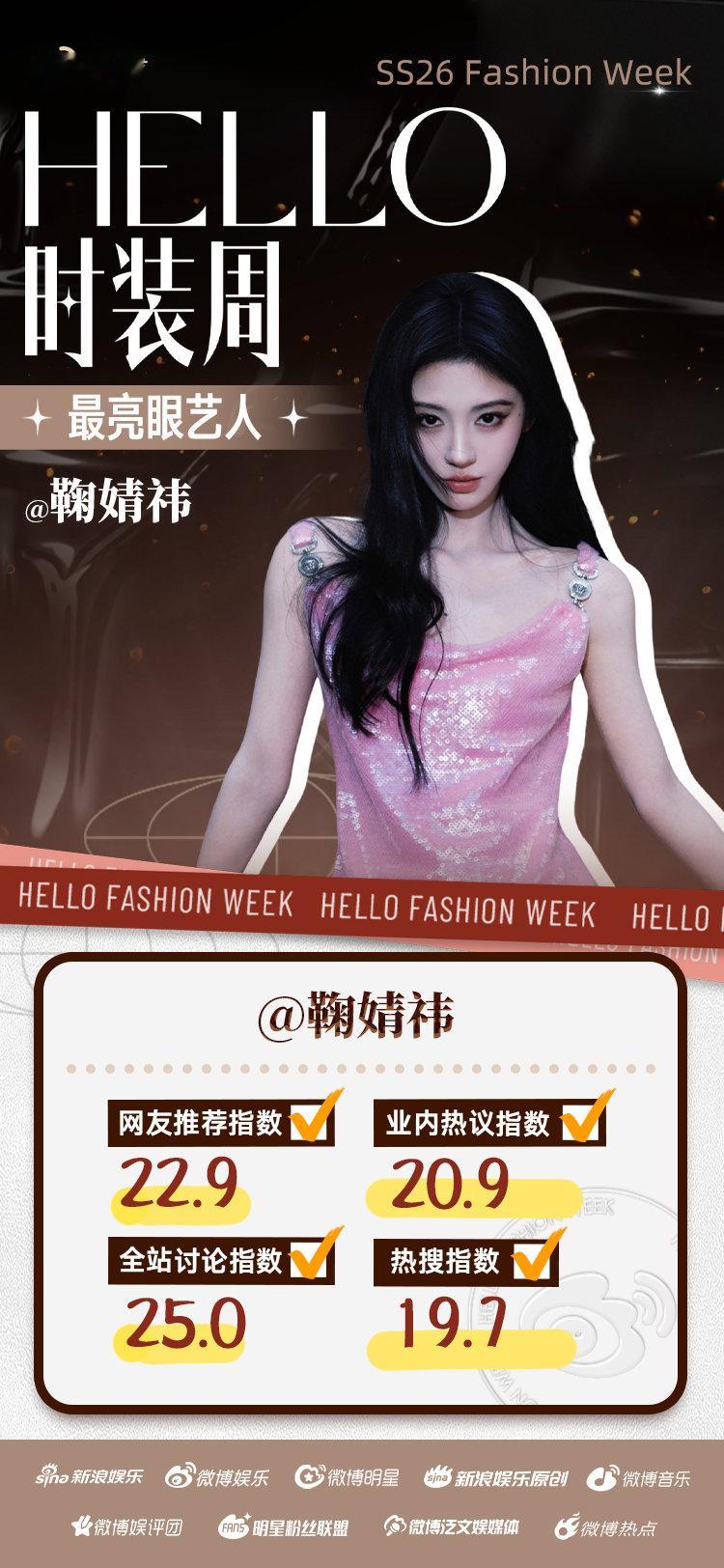 时装周最亮眼艺人TOP3 为期近一月的时装周盛宴璀璨落幕,最亮眼艺人评选结果正式揭晓!综合多维数据,荣膺主赛道前三。此外,加冕“赛博种草官”,获誉“饭撒天花板”,当选“SocialKing”。期待未来更多精彩!热巴邓为鞠婧祎最亮眼艺人前三 Hello时装周
