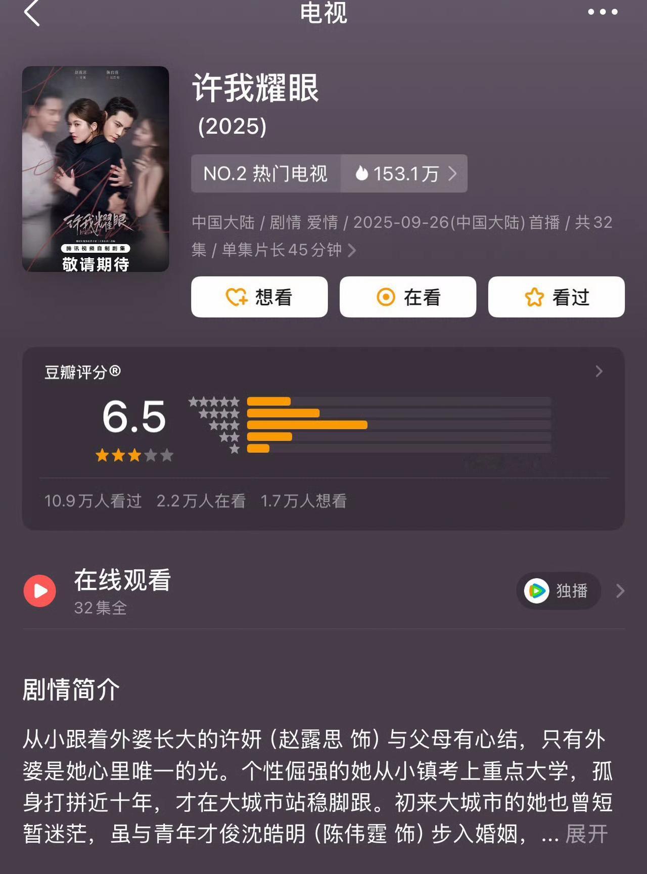 近日热播剧豆瓣评分新鲜出炉啦,大家觉得高了还是低了? 赵露思、陈伟霆《许我耀眼