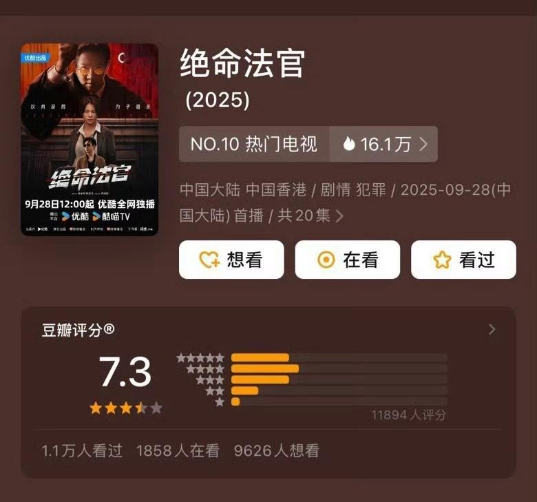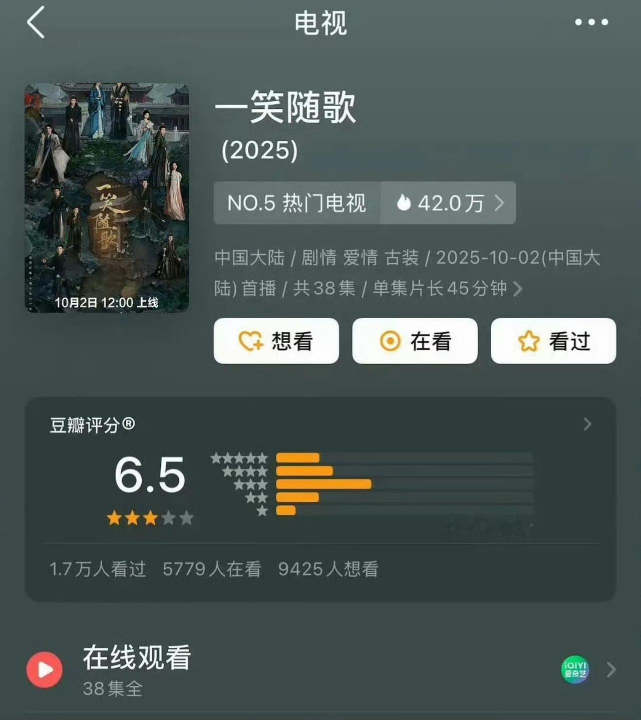 近日热播剧豆瓣评分新鲜出炉啦,大家觉得高了还是低了? 赵露思、陈伟霆《许我耀眼》豆瓣开分6.5 黄轩、李庚希《命悬一生》豆瓣开分7.6 张家辉、曾舜晞《绝命法官》豆瓣开分7.3 陈哲远、李沁《一笑随歌》豆瓣开分6.5 李昀锐、王影璐《宴遇永安》豆瓣开分5.9 由此来看,悬疑剧还是大家心头好,虽然热度和讨论度不高,但口碑都整体不错。反观古偶,可能真的是看腻了,热度口碑都不太行。 其实目前这个阶段《一笑随歌》还是挺好看的,评分感觉低了些。大家觉得呢?