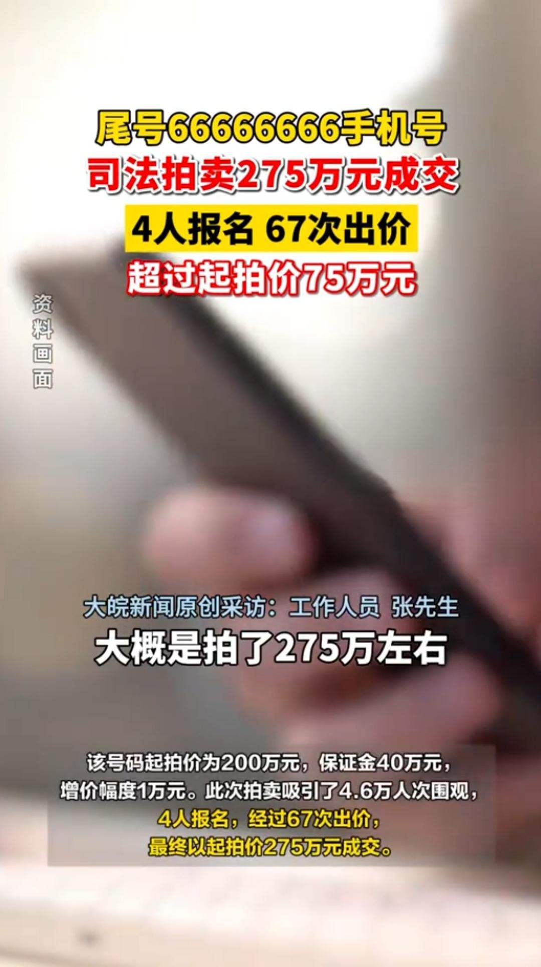 275万成交!8个6手机号遭疯抢,4人拉锯67轮 10月17日,阿里资产平台上一场手机号拍卖落下帷幕。归属山东枣庄的中国移动手机号“1==**66666666”,最终以275万元天价成交,这场由郑州高新技术产业开发区人民法院处置的拍卖,引来了4.6万人次围观。 4名竞买人从起拍价200万元开始角逐,每次加价最低1万元,硬生生把原定上午10点结束的拍卖拖了近2小时。价格突破230万后,两名竞买人更是展开拉锯战,67轮出价后才分出胜负。有意思的是,这个身价百万的号码还欠着11.74元话费,每月159元套餐过户后可能变动,欠费得买家自掏腰包。 这事儿能闹得这么热闹,根源在于靓号背后的“数字魔法”。数字“6”向来被视作“顺利”的象征,8个连号的组合堪比手机号里的“大熊猫”,运营商停发后更显稀缺。对不少人来说,它早不是通讯工具,而是张“隐形名片”——商务场合递出这样的号码,像在低调秀实力。还有人把它当投资品,之前山东同类型号码拍过249万,南宁8个7的号码溢价近200%,让人心动。 身边朋友都看懵了,有人算过:275万存银行,利息够交几千年话费。可在竞买人眼里,这数字里藏着面子和期待。 花几百万买串数字,真能买到想要的“顺利”吗?手机号 豹子号手机靓号 移动号码 手机靓号估价 天价手机号 作者声明:素材来源网络