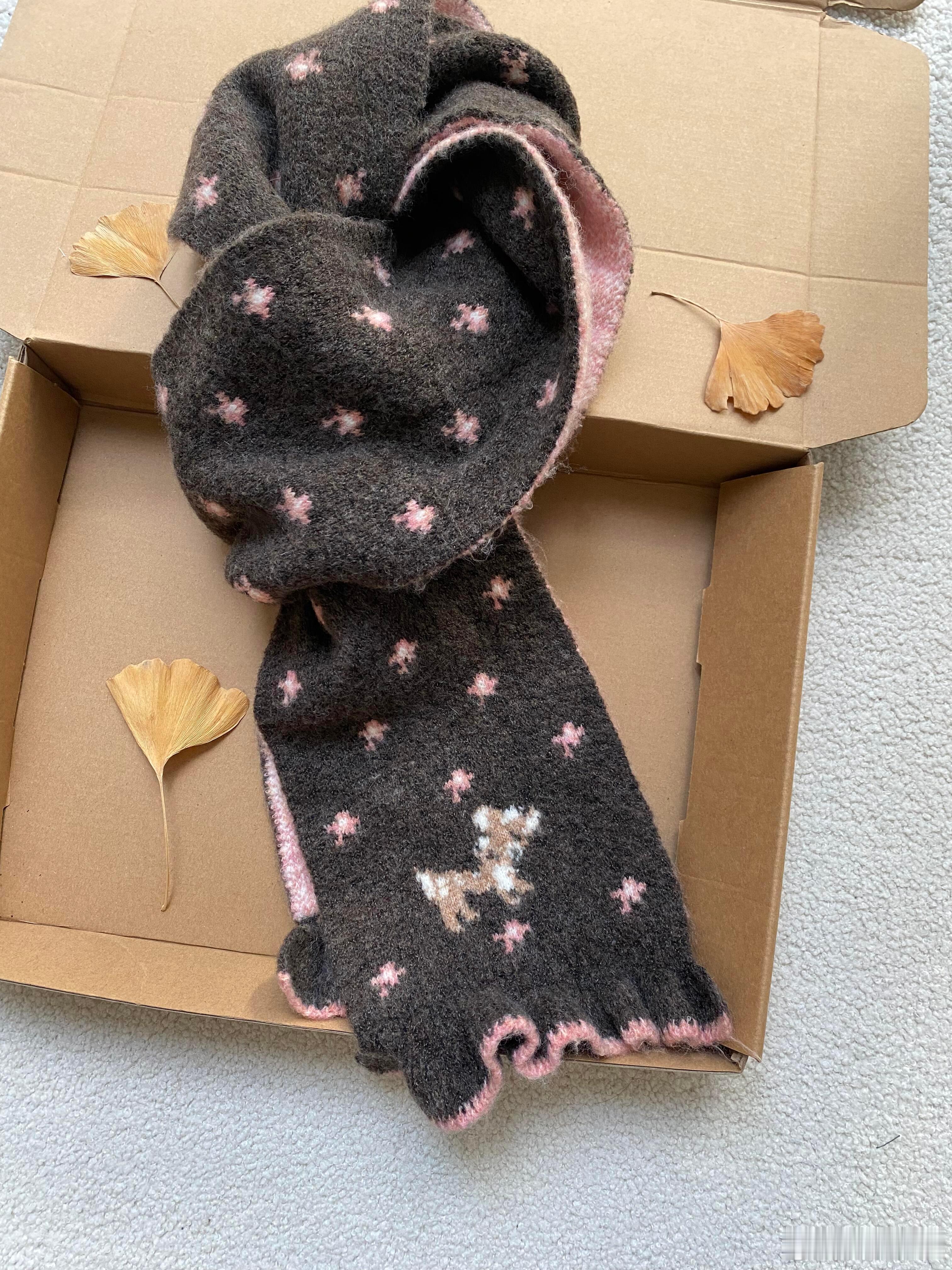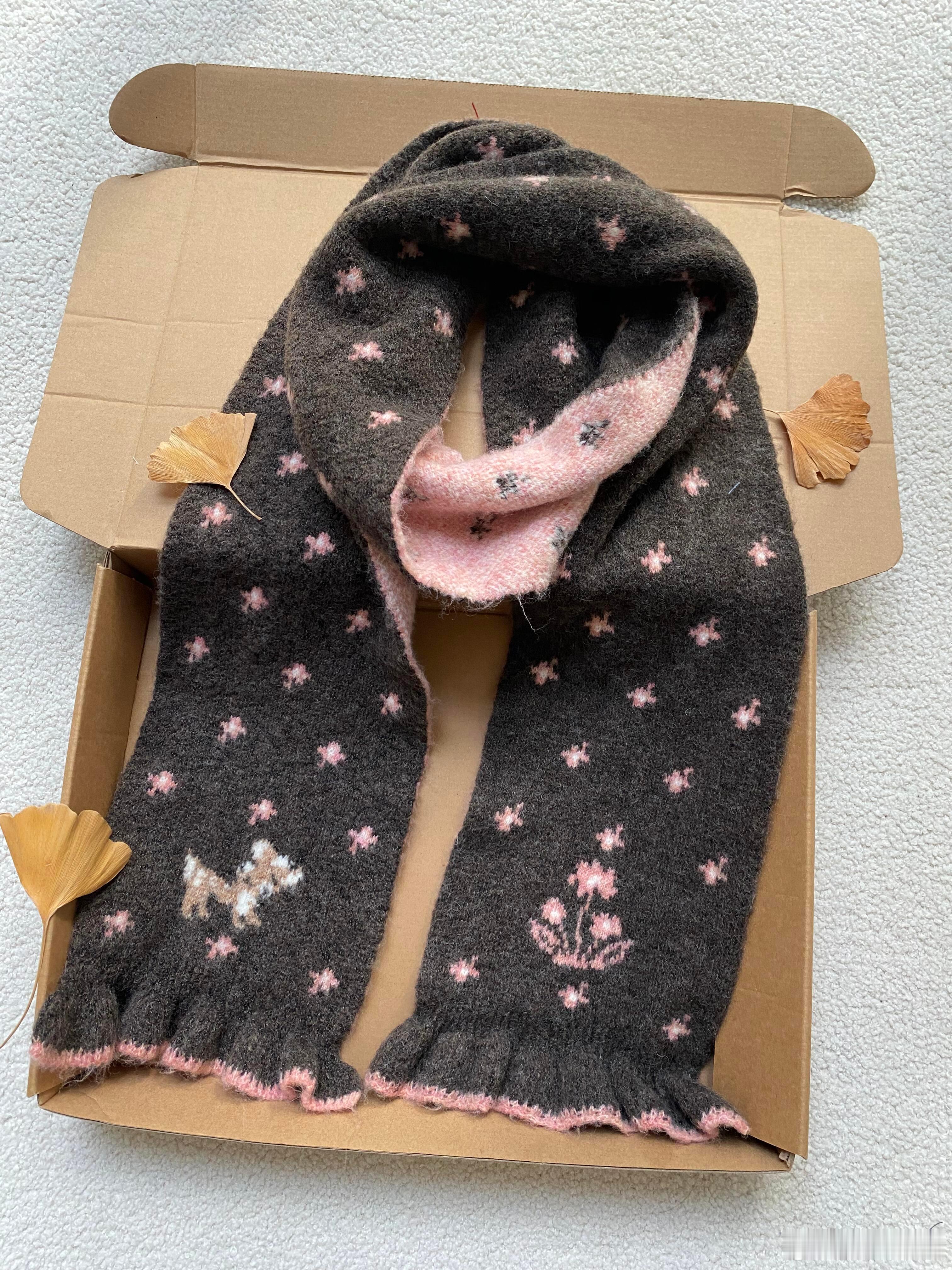这条围巾静置于开启的棕色礼盒中,深灰色羊绒质地温柔亲肤,成为粉色小星星图案的完美画布,瞬间点亮整体。其设计别具匠心:底部点缀着灵动的白色荷叶边,并绣有一只俏皮的浅色小狗图案,内侧则采用柔和的粉色衬里,细节处处流露甜美心意。周围散落的金黄银杏叶与白色毛绒背景相互映衬,共同营造出秋日独有的温馨与浪漫氛围。整体风格精致可爱,完美融合了细腻的少女感与厚实的温暖特质,是一件兼具颜值与实用性的贴心好礼。时尚配饰
