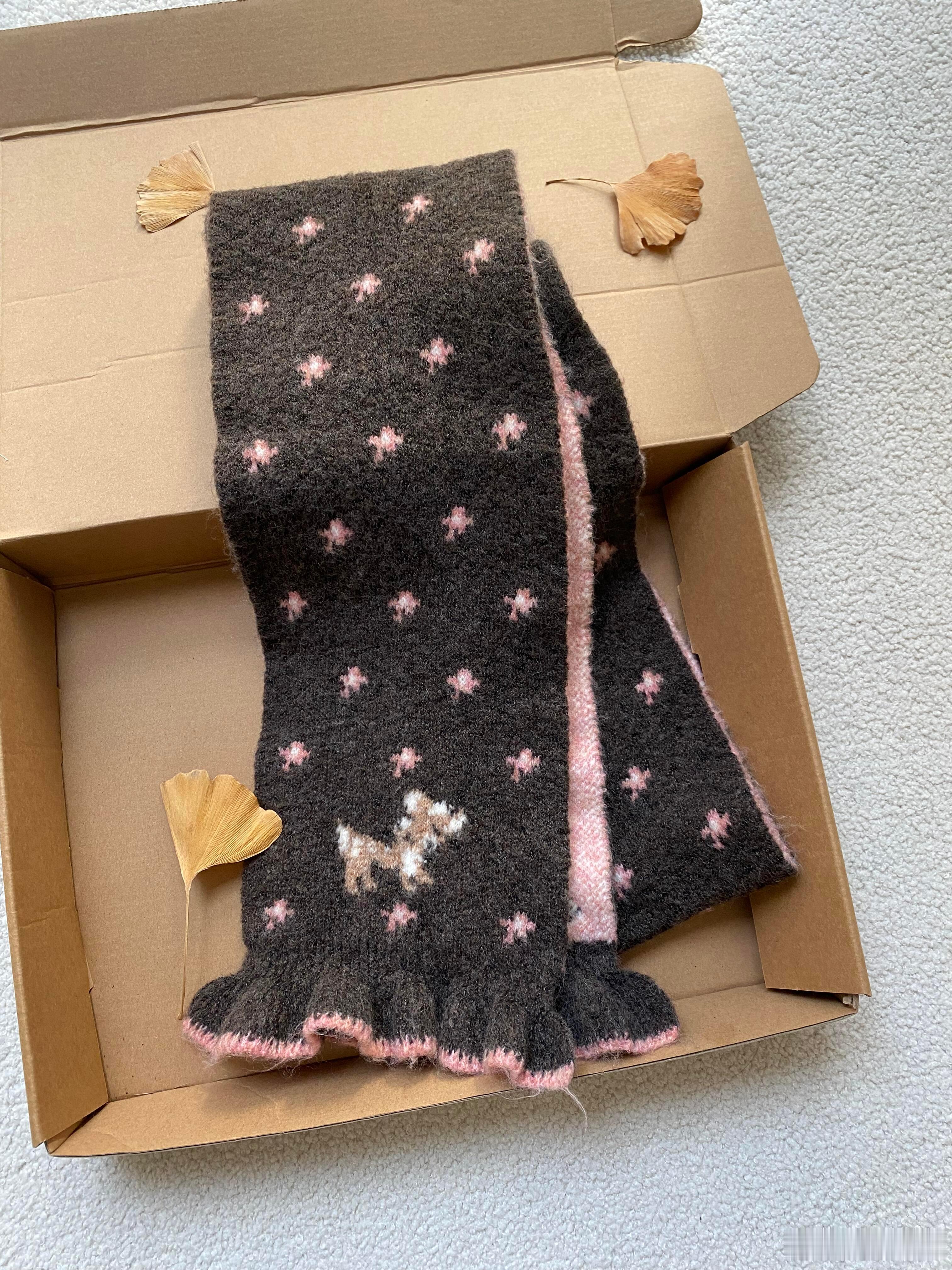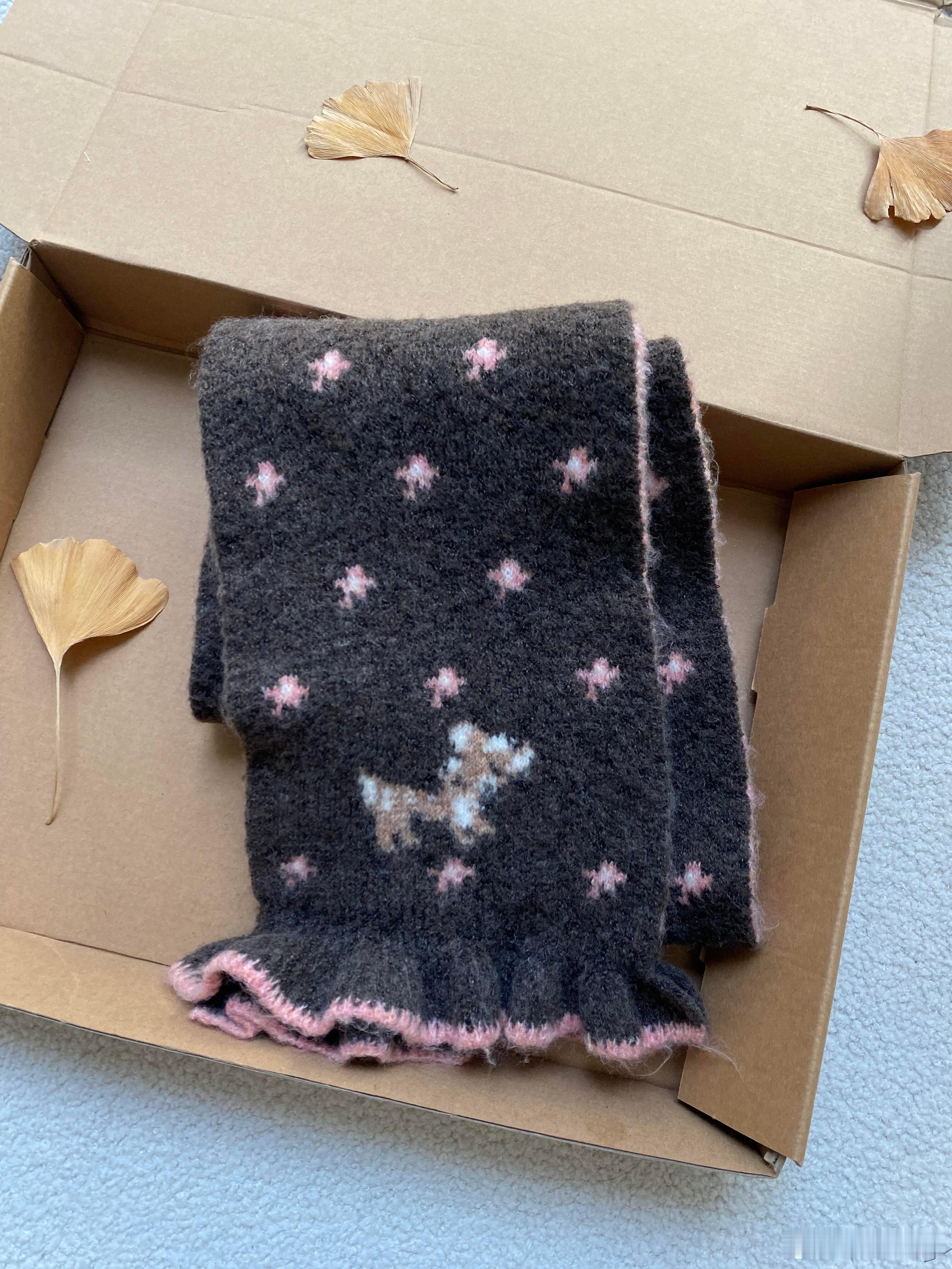 这条围巾静置于开启的棕色礼盒中,深灰色羊绒质地温柔亲肤,成为粉色小星星图案的完美