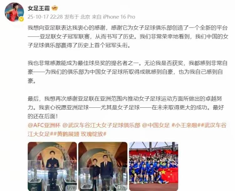 王霜情商在线,虽未获奖仍发文致谢亚足联,并祝愿亚洲女足“最好的还在后面”。 亚洲足球年度大奖设那么多,中国足球却整了个鸭蛋,正装出场等着领钻石奖的老宋很是难愖,既不向获奖者表示祝贺、也不表态中国足球如何学习如何追赶,更没有任何面向公众的致歉,好像今后的一切与己无关。 但王霜不同,专门发了个未获奖感言,一方面因武汉女足问鼎亚冠,她被提名亚洲足球小姐候选,有说话的本钱;另一方面,年轻的王霜和武汉女足还要踢亚冠,她的发文也算一次能力范围对亚足联的公关。 王霜有这个情商,真希望她未来退役后能就职亚足联,别让中国足球在亚洲进一步走向边缘。