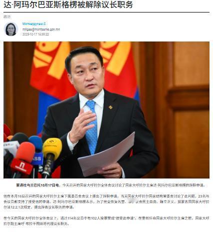 蒙古国达·阿玛尔巴亚斯格楞被解除议长职务 蒙通社乌兰巴托 10 月 17 日电,今天召开的国家大呼拉尔全体会议讨论了国家大呼拉尔主席达·阿玛尔巴亚斯格楞的辞职申请。 他在本月 16 日召开的国家大呼拉尔主席下属委员会会议上提出了辞职申请,当天国家大呼拉尔国家机构常委会讨论了此问题,23 名与会议员都支持了接受他的申请。达·阿玛尔巴亚斯格楞表示,为了完全恢复名誉、维护议会民主自由、确立正义,据蒙古国国家大呼拉尔法 12.2.1 款规定,提出辞去议长职务的申请。 在今天的国家大呼拉尔全体会议上,通过 114 名议员中有 102 人投票赞成"接受此申请"。在重新任命国家大呼拉尔主席之前,国家大呼拉尔副主席呼·布拉干图娅将代理议长职务。