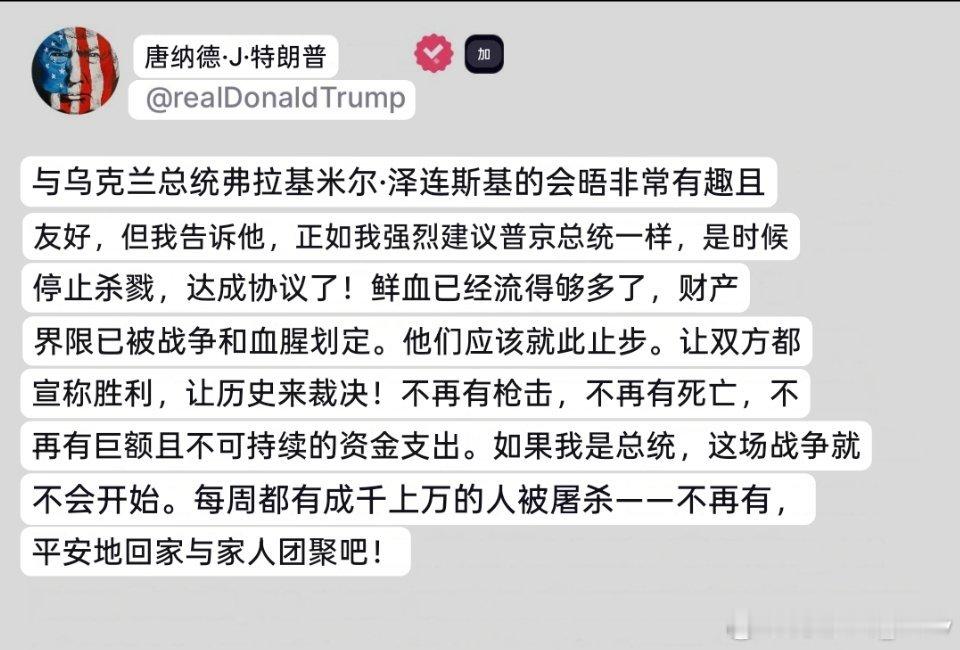 他表示自己已经告诉泽连斯基和普京,是时候就此止步,“让双方都宣称胜利,让历史来裁决!”