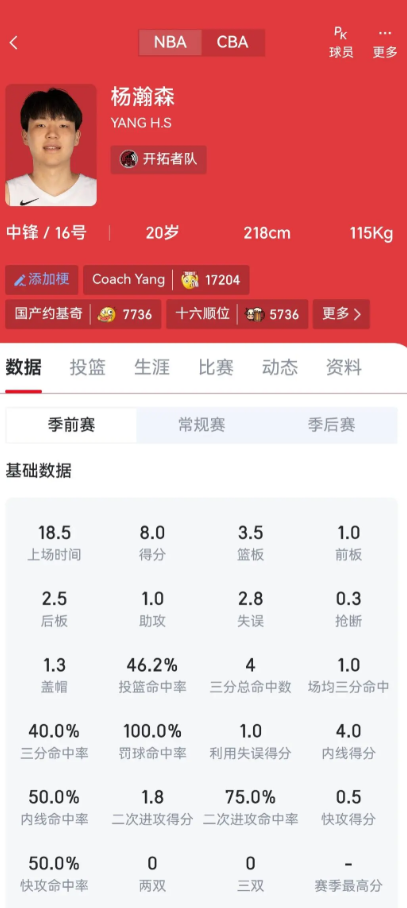 杨瀚森和约老师,小萨,申京的季前赛数据对比 新秀赛季季前赛 申京场均:18.5分钟9.75+7.78+2.25+0.75+1.5+2失误+3.25犯规 命中率:47.7+0+70.825 小萨场均:20.375分钟 6+2.25+2+0.5+0+1.75失误+3.5犯规 命中率:43.75+12.5+58.3 约基奇场均:21.7分钟 11.71+5.2+0.5+1.14+0.5+1.4失误+3.2犯规 命中率:75.3+50+61.7 杨瀚森场均:18.5分钟 8+3.5+1+0.3+1.3+2.8失误+5.3犯规 命中率:46.2+40+100 这份数据表明,杨瀚森拥有成为优秀内线的天赋基础。他的篮板,犯规和失误问题,是所有年轻内线成长的必修课。从约基奇到申京,他们都经历了从适应到主导的过程。对于杨瀚森,我们需要给予足够的耐心和时间。从数据看,小杨表现其实中规中矩,没有特别差,目前来看,可能小萨的生涯发展轨迹最符合他。
