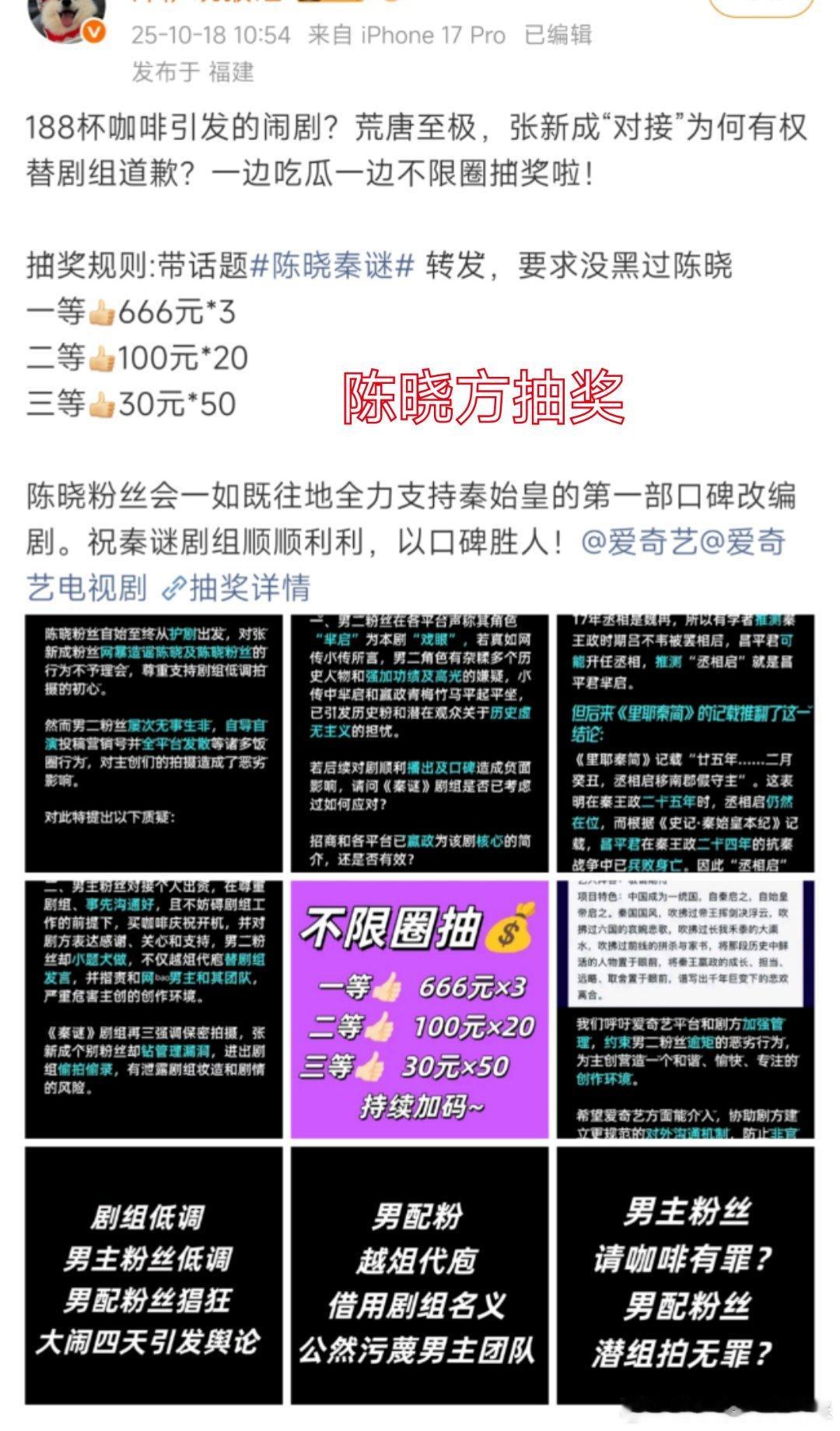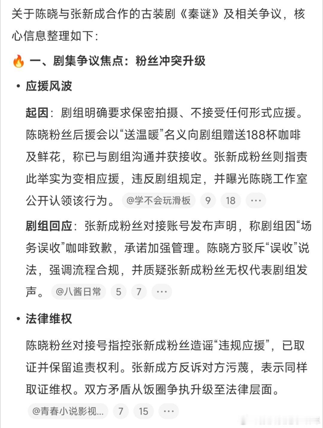 《秦谜》男主陈晓,男二张新成两家粉丝因为188杯咖啡,相互表示要提告对方,对簿公堂了[允悲][允悲]