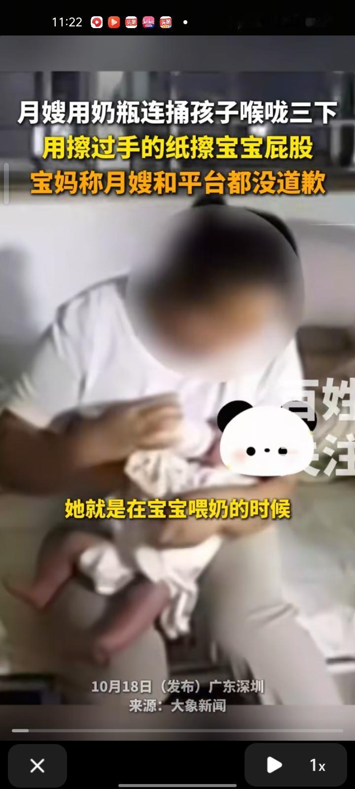 10月13日,广东深圳。宝妈文女士反映,月嫂给宝宝喂奶时,宝宝的手一直放在上面,她就把宝宝的手弄下来,随后用奶瓶连捅宝宝的喉咙,还用擦过纸的手给宝宝擦屁股,动作极其粗鲁。宝宝被搞出毛病了,月嫂和公司平台都没有给过一句道歉。咱就是说,现在找个专业的月嫂怎么这么难