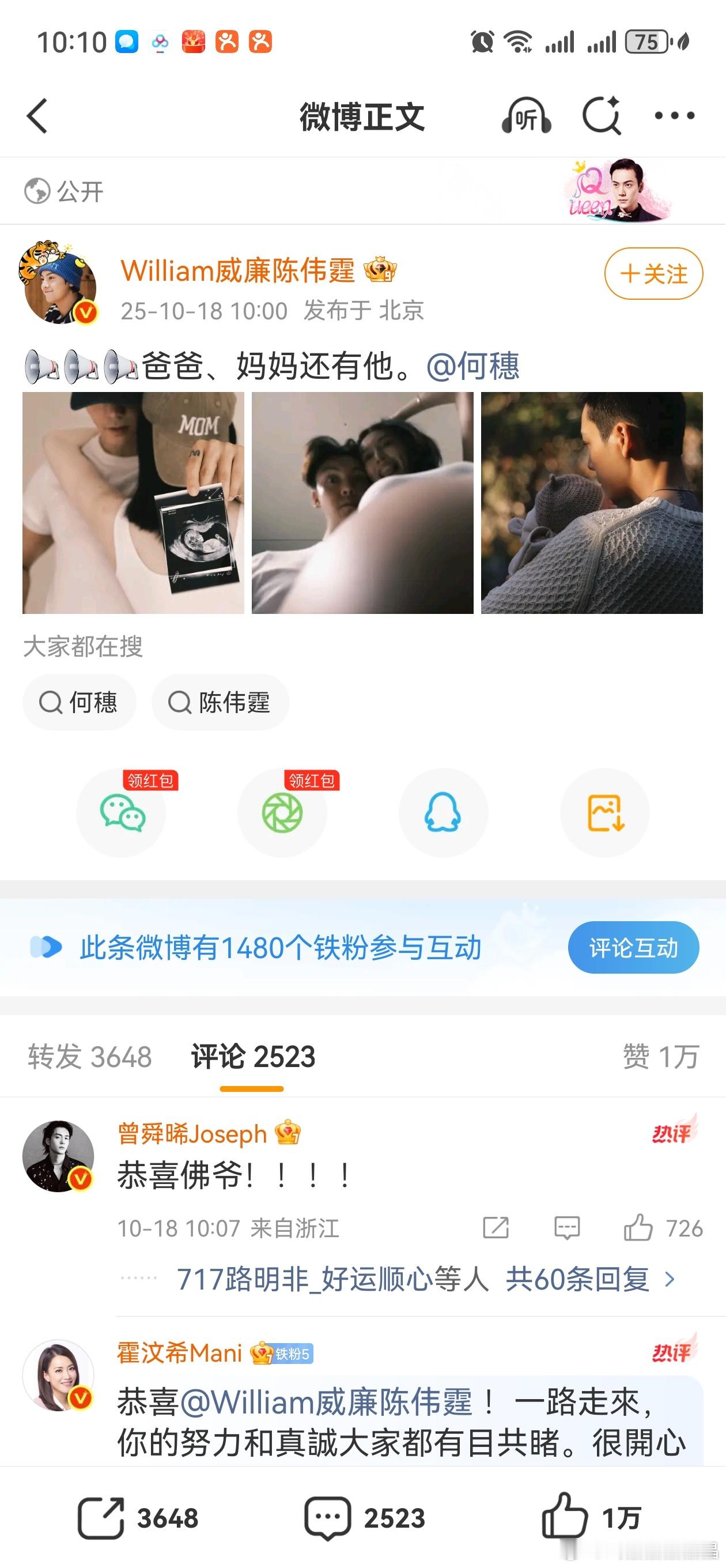 陈伟霆官宣当爹了!恭喜恭喜![鼓掌][鼓掌][鼓掌] 陈伟霆何穗官宣生子
