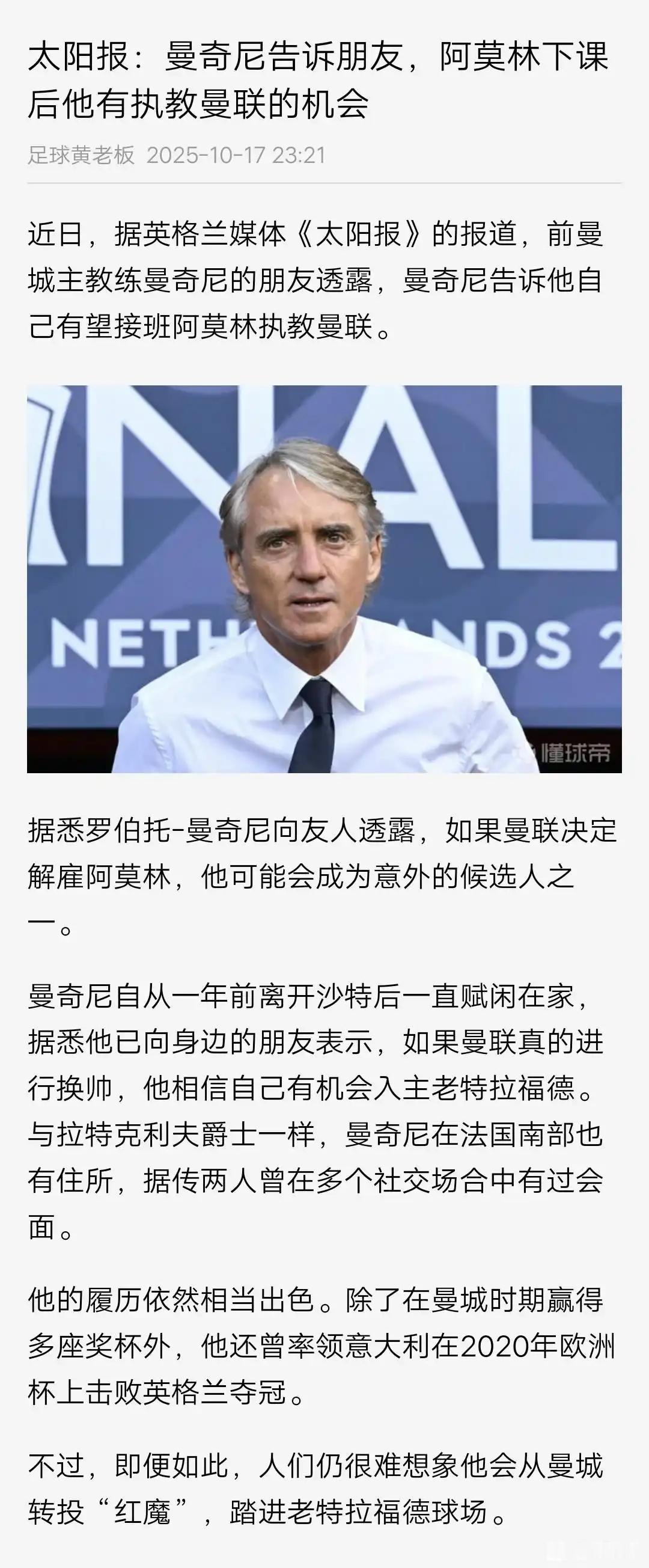 曼奇尼说他会执教曼联? 本周末曼联对利物浦,如果惨败估计阿莫林要下课。 如果曼联赢下利物浦,曼奇尼在做梦! 我就认为曼联换不换帅,对利物浦的比赛很重要。 输赢就在一场比赛,其实也合理。[偷笑]
