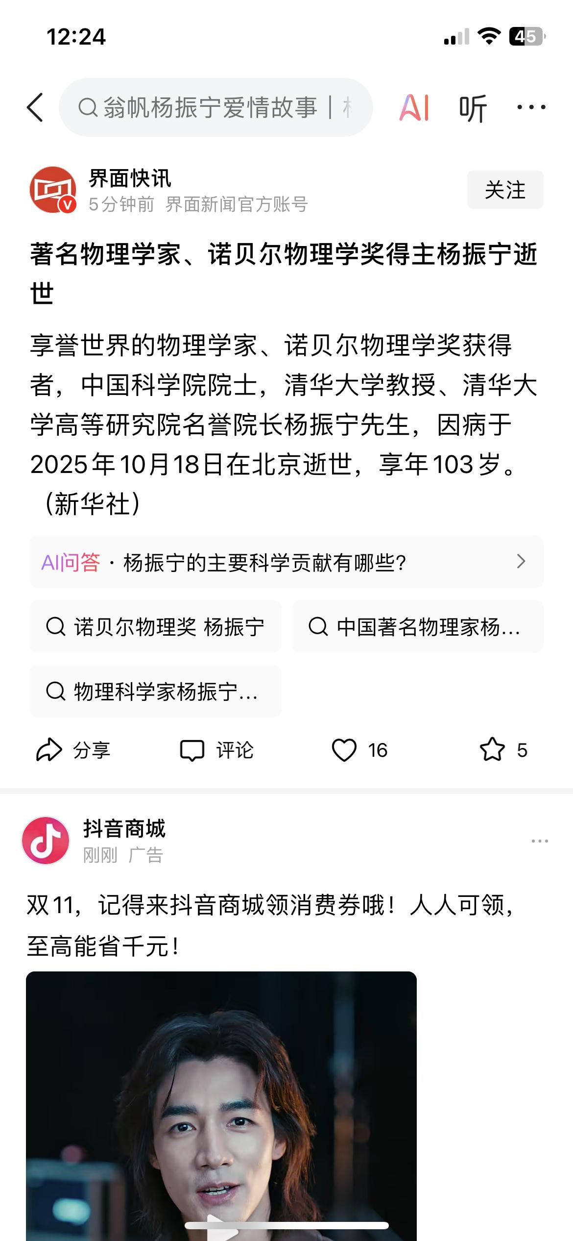 这昨天还没事呢,今天就…… 物理学家杨振宁因病于2025年10月18日在北京逝世,享年103岁。