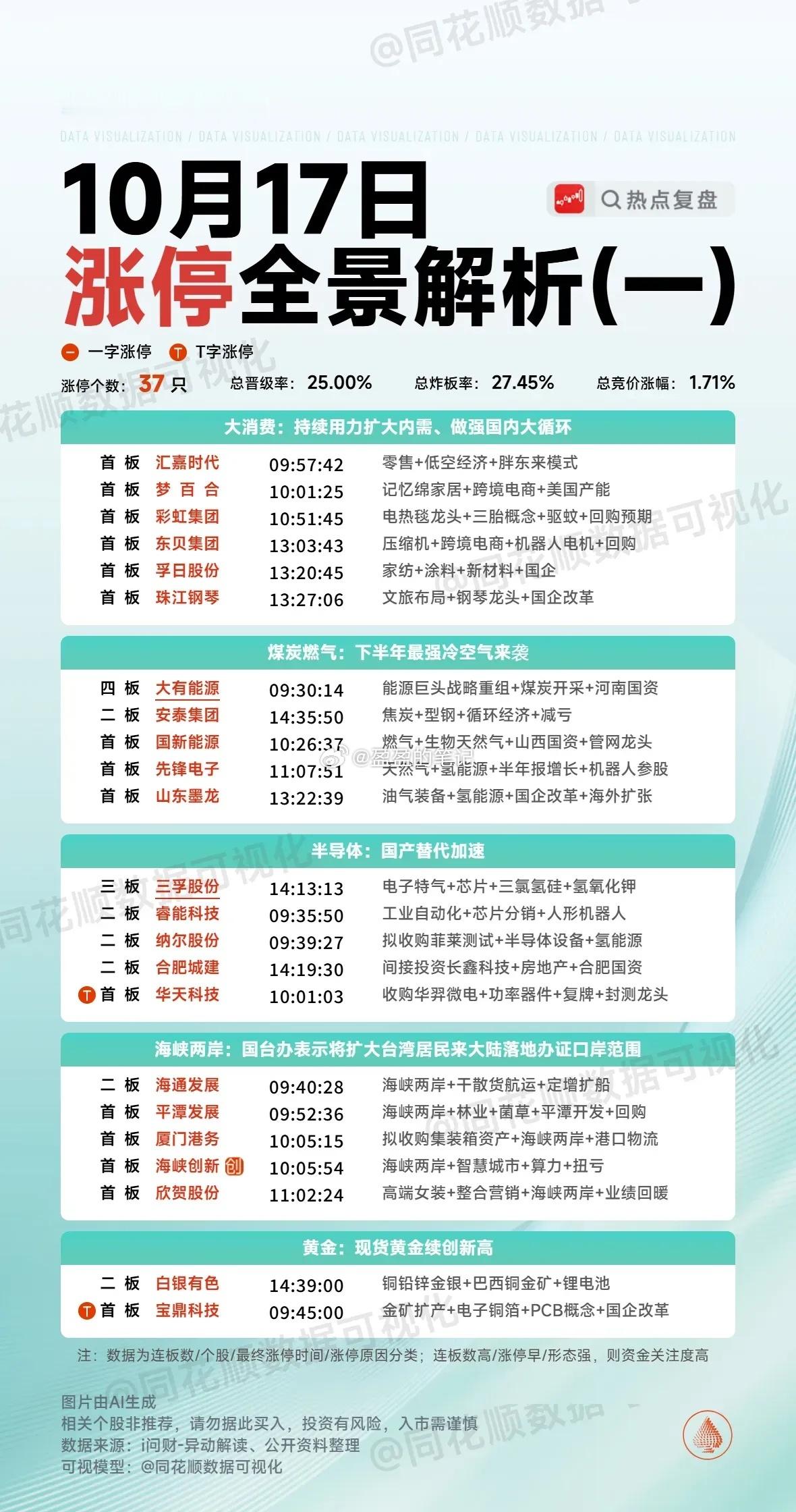 盘后的龙虎榜是3日榜,买卖盘除了沪股通外,其余席位都不一样,在结合10月16日的榜单看,17日新进场的资金有华源深圳分、流沙河和光大总部基地,卖盘基本上跟16日的卖盘一致,也就是说17日几乎没有抛压,这是一个资金集体看多的榜单,所以隔日大有的预期是非常高的,但是考虑到煤炭方向尾盘整体也是跳水翻绿,这个方向隔日早盘能不能止跌稳住趋势是大有能不能持续走出来的关键,单从人气和强度上看,大有是强于同身位的远大的,但是这只个股毕竟已经4板了,最近连续多只个股都是止步4板,大有和远大能不能突破是周一的另外一大看点,但是从之前澄星晋级失败的教训看,如果要走缩量晋级,至少板块要表现非常强,反之,也许在早盘板上放出足够量能再去封板晋级的希望才会更大,所以对于大有来说,早盘的冲板动能和板上放量分歧承接是它能否晋级必不可少的两大关键因素!