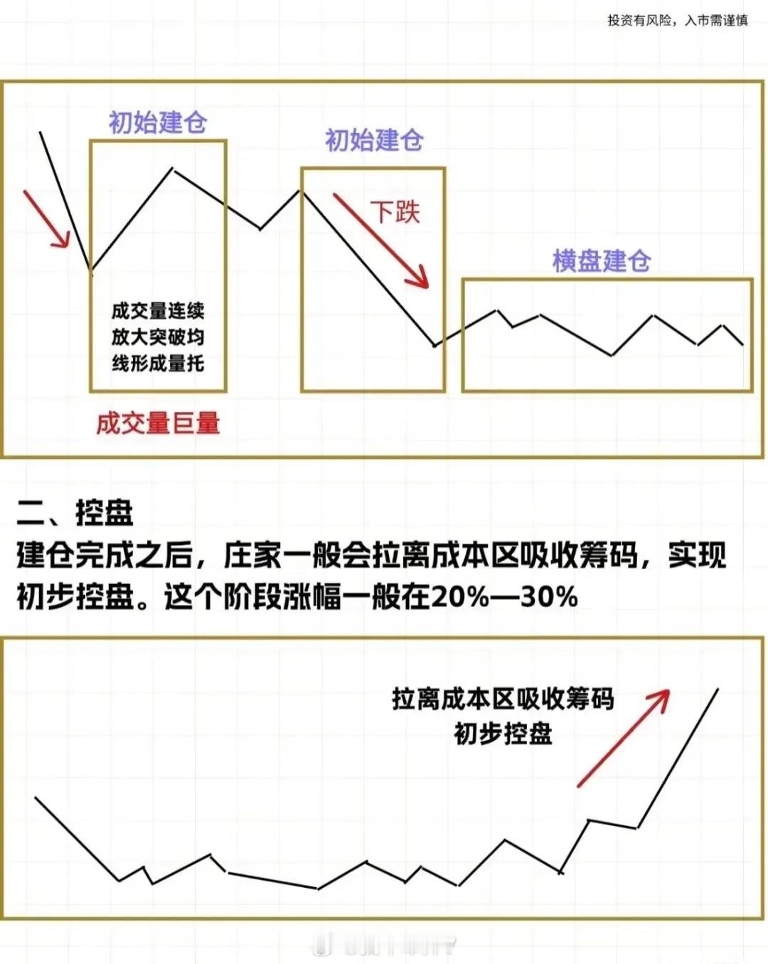 当庄家完成初步建仓后,会将股价拉离其成本区域,进一步吸收筹码,达到对股票一定程度的控制,也就是初步控盘。这一阶段股价通常会有约20%的涨幅,目的是为了后续操作打下基础并稳定持仓。