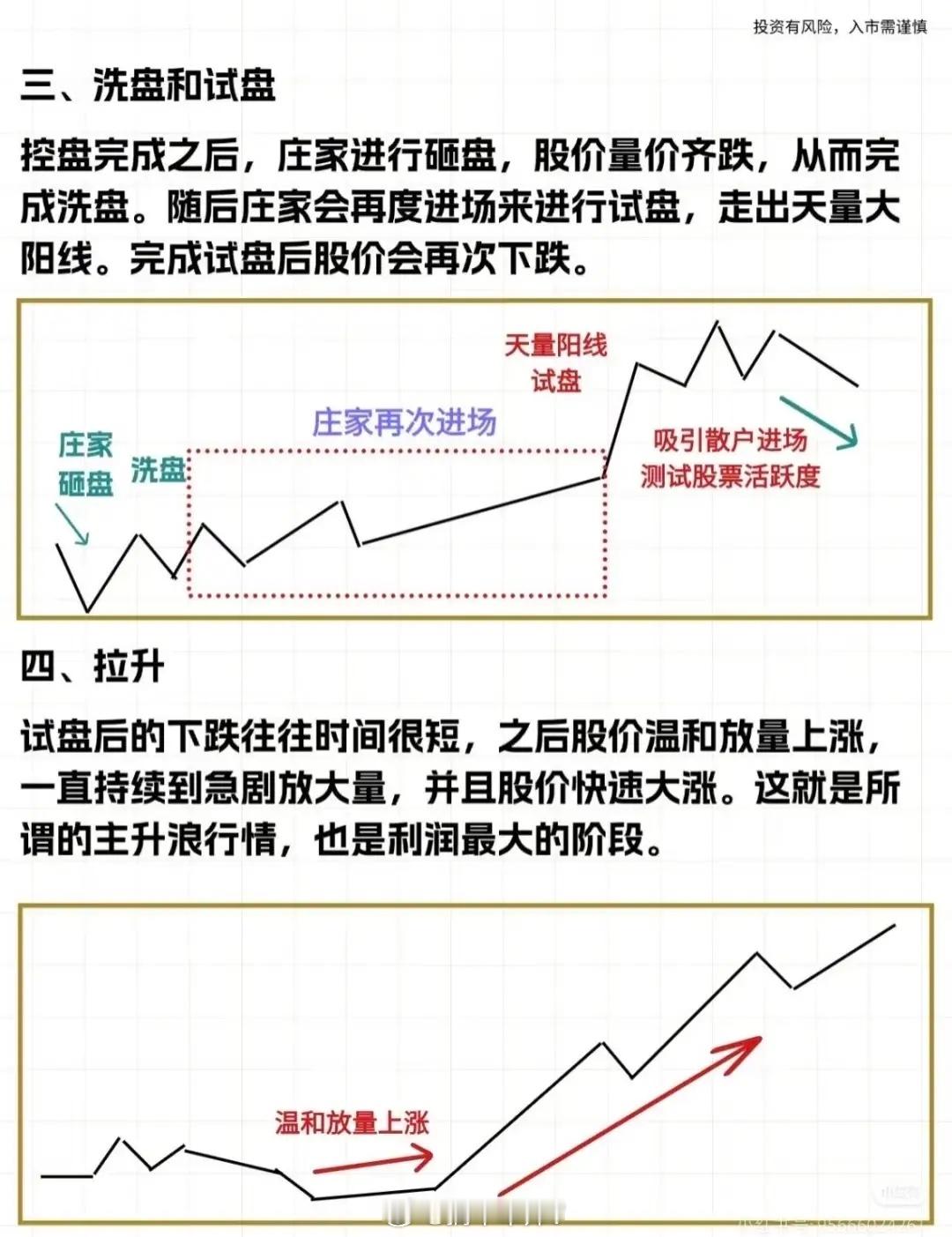 庄家坐庄一般经历建仓(吸筹)→控盘(拉离成本、巩固持仓)→洗盘与试盘(清理浮筹、试探市场)→拉升(主升浪、吸引跟风)→出货(高位套现)这五个主要步骤。整个过程庄家通过操控股价和利用市场心理,引导散户在不同阶段做出相应操作,最终实现低买高卖、获取利润的目的。图片也多次提醒:“投资有风险,入市需谨慎”。