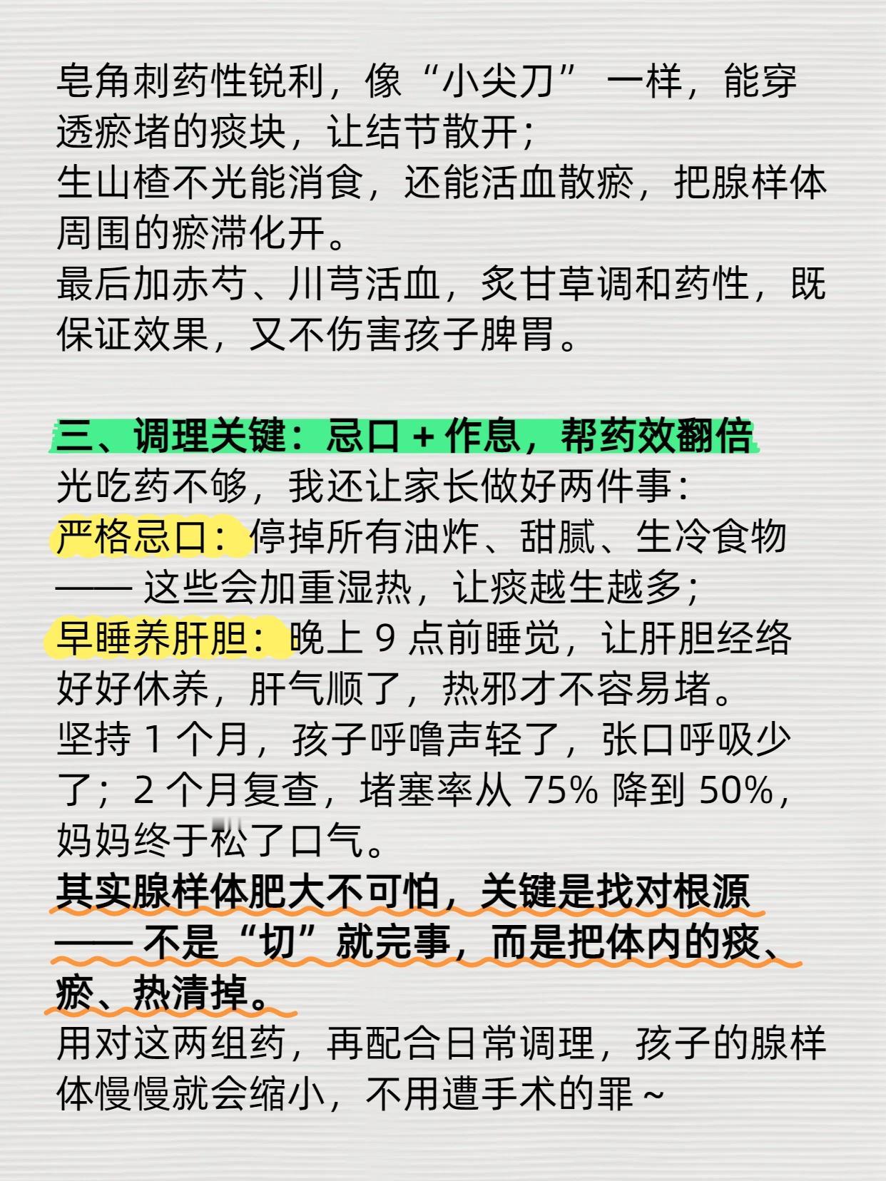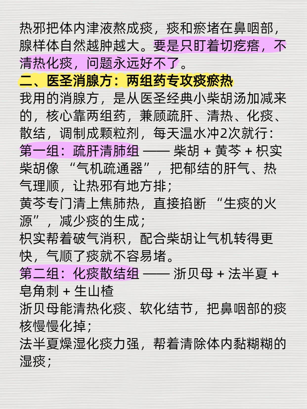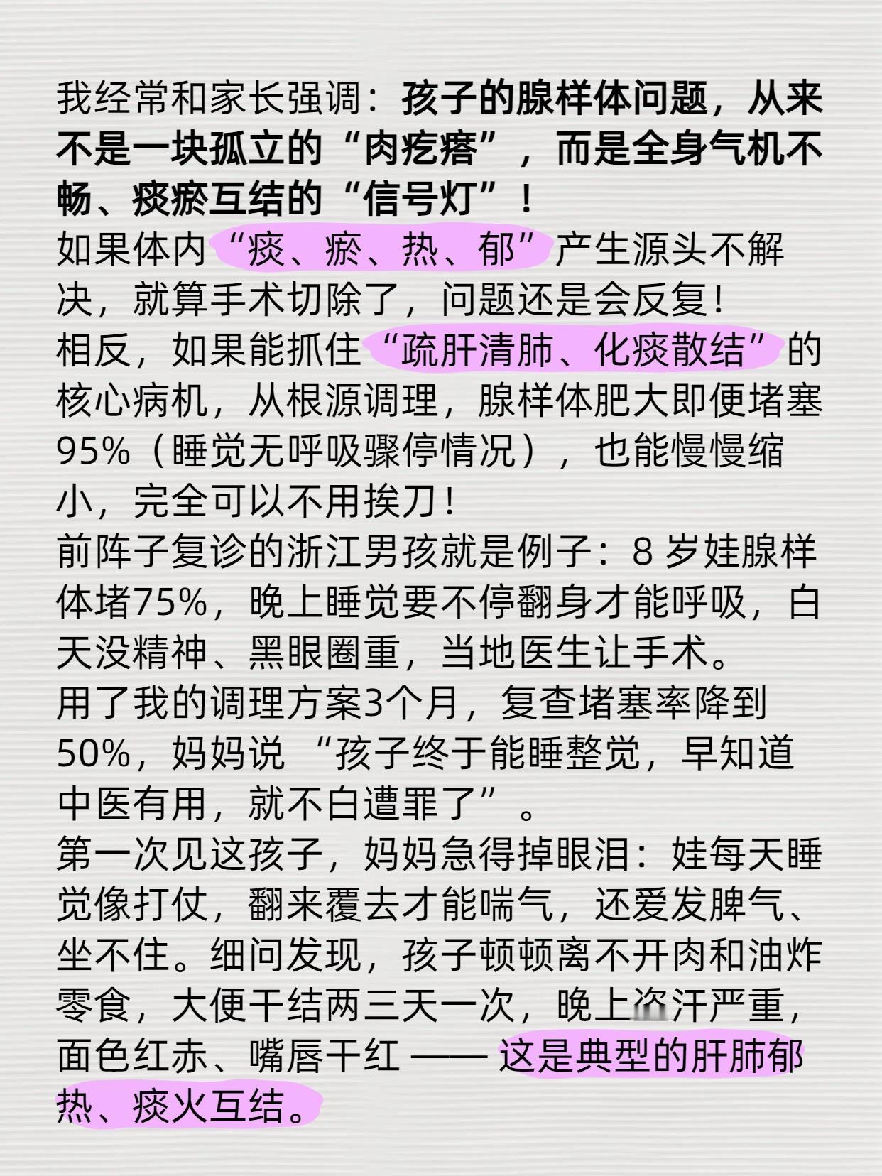 腺样体肥大就怕两组药!医圣传授下来的“消腺方”,一天冲水喝两次,消痰化瘀、散结利窍,腺样体肥大见了就跑 总跟家长说:孩子腺样体不是孤立的 “肉疙瘩”,而是体内痰、瘀、热、郁堆出来的 “信号”。 就算手术切了,根源不除还会反复;但只要抓住 “疏肝清肺、化痰散结” 的核心,哪怕堵塞 95%(无呼吸骤停),也能慢慢缩小,不用挨刀! 前阵子复诊的浙江男孩就是例子:8 岁娃腺样体堵 75%,晚上睡觉要不停翻身才能呼吸,白天没精神、黑眼圈重,当地医生让手术 用了我的调理方案3个月,复查堵塞率降到 50%,妈妈说 “孩子终于能睡整觉,早知道中医有用,就不白遭罪了”。