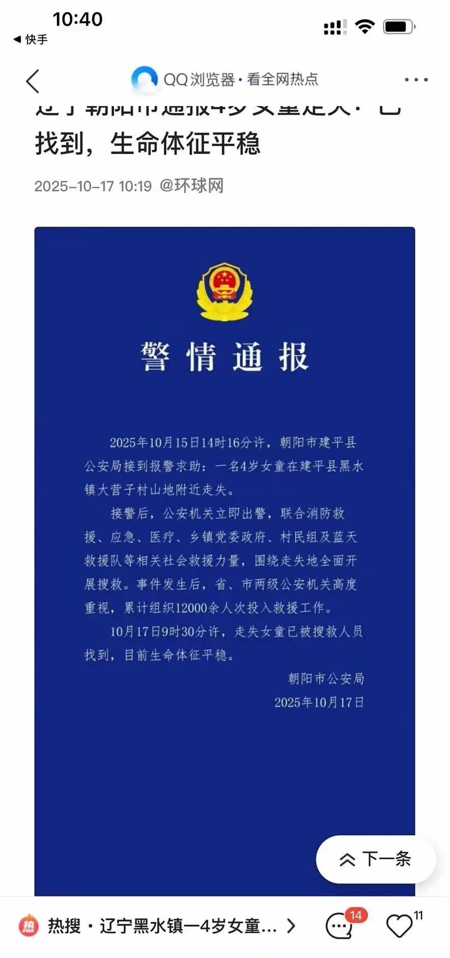 孩子找到了 暖心!辽宁黑水镇走失的四岁女童平安归来!这个勇敢的小家伙独自跋涉数公里,最终在警民联合搜救下安然脱险。目前孩子身体状况良好,正依偎在家人怀中。 这场牵动人心的搜救行动中,朝阳区公安、应急队伍与热心群众昼夜不停展开地毯式搜寻。有人送来热乎饭菜,有人提供专业设备,更有村民自发组成搜救队穿梭山林。正是这份众志成城的温暖,让奇迹在48小时内降临。 当孩子红扑扑的小脸重新出现在众人视线中时,所有疲惫都化作了欢呼。我们看见民警布满血丝却含笑的眼睛,听见志愿者沙哑却喜悦的嗓音,更触摸到这座城市的温度——那些湿透的制服、磨破的胶鞋,都是最动人的勋章。愿这份善意永远传递,守护每个家庭的团圆。
