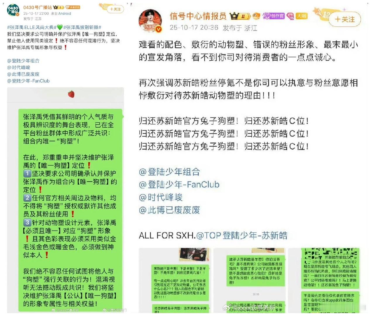 ❼楼三代,张泽禹 粉要求确立楼内唯一“狗塑”定位 ,并🈲止其他成员使用。苏新皓粉表示拒绝羊塑,只认兔子狗塑