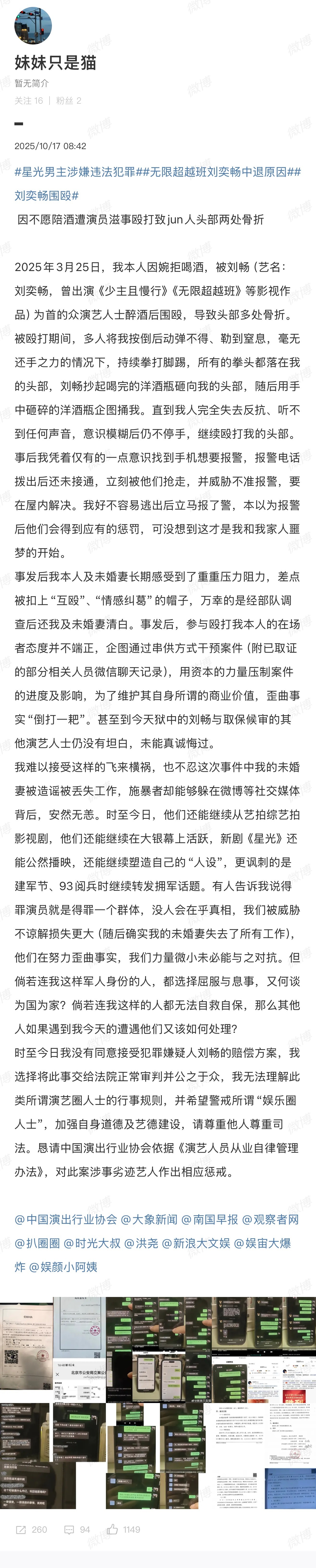 ①有网友发文控诉自己因不愿意陪酒被刘奕畅殴打,致头部两处骨折