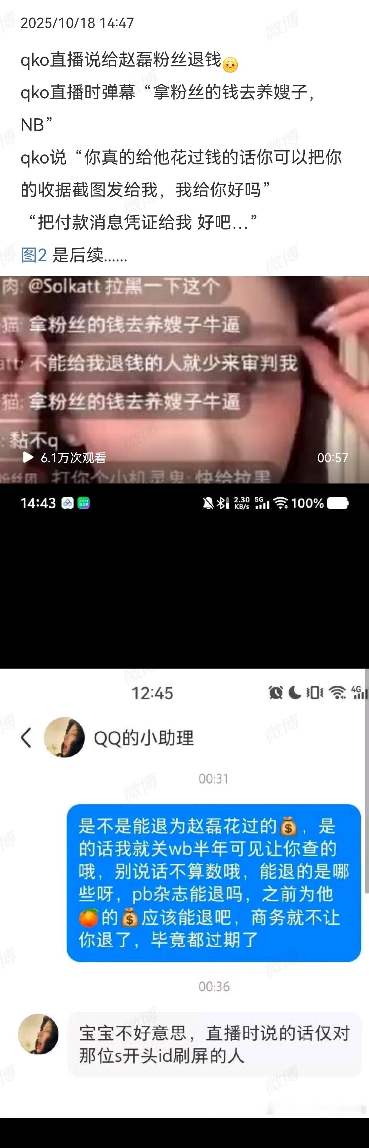 ❸赵磊老婆在直播间说,要给赵磊花了钱的粉丝退钱,后有粉丝找她要钱,她又说仅针对直播间弹幕的那个人