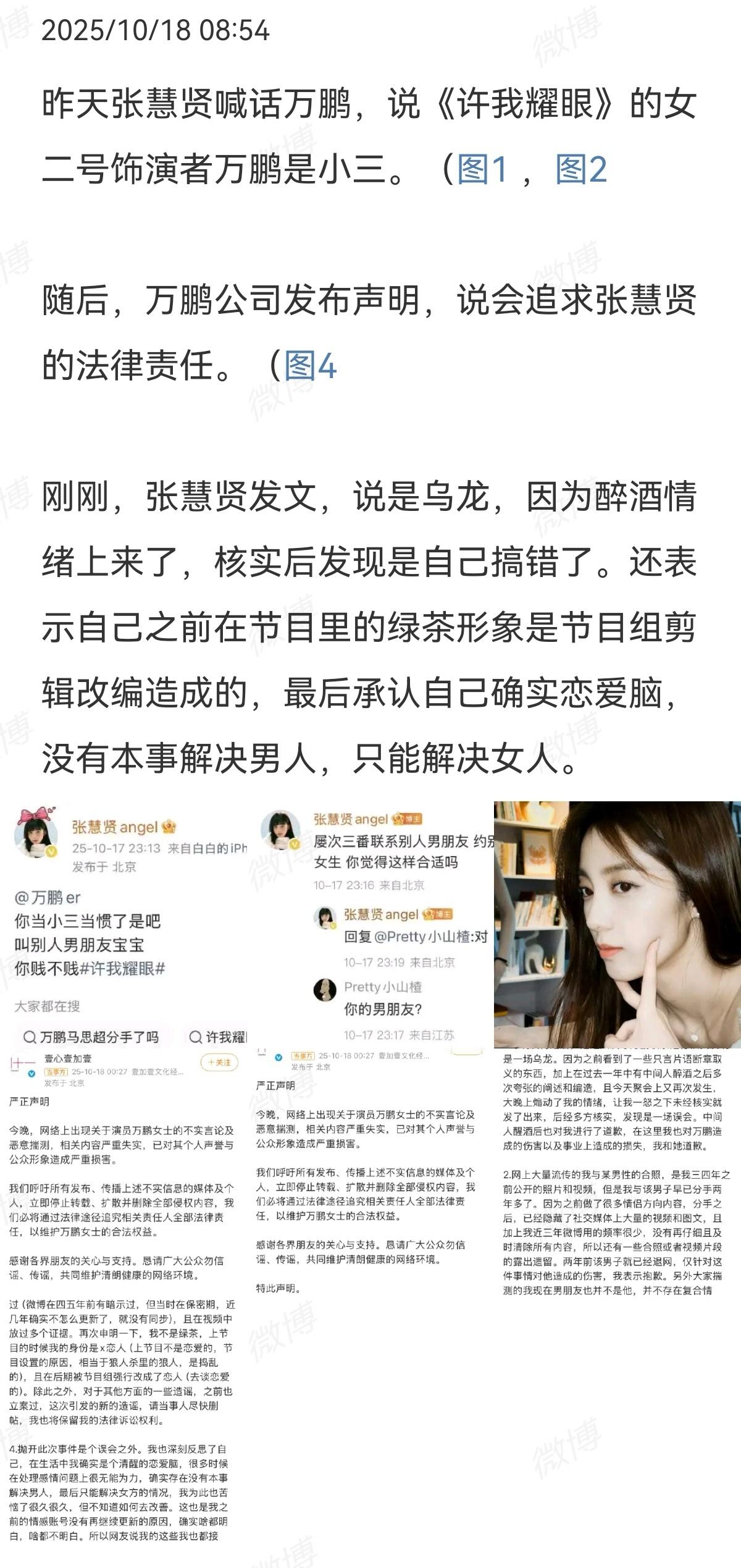 ⑤网红张慧贤说万鹏约她男朋友,万鹏公司发布声明,追究责任,后续张慧贤发文说是乌龙,道歉