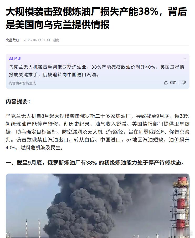 “乌克兰无人机效果贼好,毛子石油产能损失了30%……”