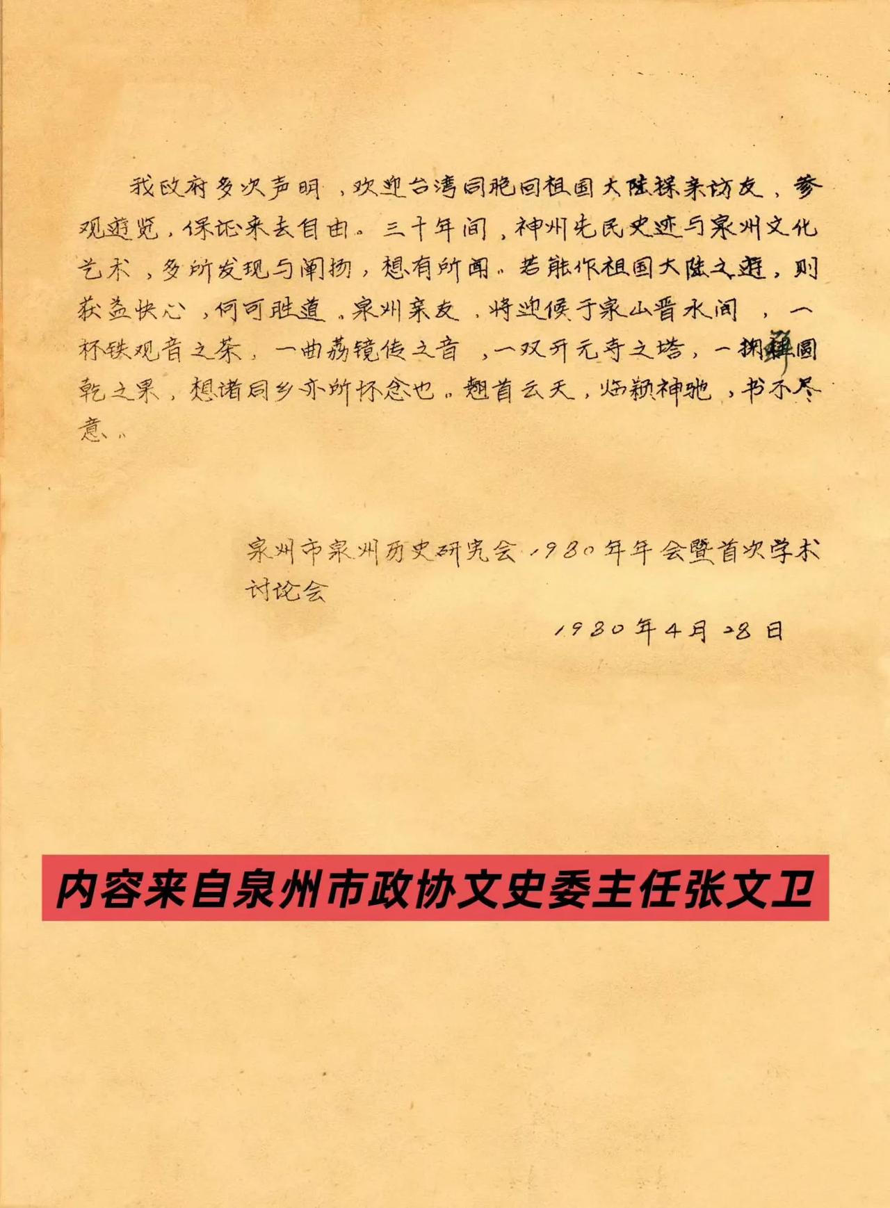 泉州市泉州历史研究会《致台湾诸泉州同乡书》 (陈泗东篆) 台湾诸泉州同乡钧鉴: 泉州市泉州历史研究会于1980年4月25日至28日举行1980年年会暨首次学术讨论会,旨在加强团结,切磋学术,商讨泉州地方史之搜集、整理与研究工作,以发扬我中华民族之文化,阐述我泉州桑梓之故实。闽南学人,温陵耆宿,欢聚一堂,诚泉南史学界之盛会也。大坠门与鹿耳门相望,清源山共阿里山一色,只以人事睽违,未能亲聆居台诸同乡之教益,殊以为憾! 溯自晋人南渡,聚居晋江两岸,泉州代有闻人。刺桐之港,石笋之城,早已驰誉世界。其间山川名胜、文物古迹、文化艺术、风土民情,足资记述者甚多。泉人素称进取,飘洋过海,奋发于惊涛骇浪之中,泉州与台湾一水之隔耳,泉之先民,对台湾之开发,尤有力焉。史家之责,在明治乱之迹,通古今之变。我中华民族历史悠久,文物灿然,夙具极大生命力与凝聚力,虽多经内忧外患,此种力量迄未稍衰。每当国家统一,民族团结之时,国力即臻强盛,对世界文明贡献亦大,凡此皆国人所熟知,而我泉人,感觉尤切。昔乡先贤郑延平率乡人驱逐荷人,复我故土,辟台湾之荆榛。郑克塽率众来归,使亲人得团聚,促历史之发展,固时世之必然,亦史乘所嘉许。诸君或奕世居台,或一身寄寓,爱国之念甚强,爱乡之思倍切。我会研究泉州历史,首当研究中华民族之发展历史,以促进祖国统一早日实现,俾游子还乡,睹松菊之更茂,悦亲戚之情长,而研究泉州历史,亟需诸同乡共同协助,群策群力,俾数典忆祖,为桑梓效力。 我政府多次声明,欢迎台湾同胞回祖国大陆探亲访友,参观游览,保证来去自由。三十年间,神州先民史迹与泉州文化艺术,多所发现与阐扬,想有所闻。若能作祖国大陆之游,则获益快心,何可胜道。泉州亲友,将迎候于泉山晋水间,一杯铁观音之茶,一曲荔镜传之音,一双开元寺之塔,一掬鲜桂圆之果,想诸同乡亦所怀念也。翘首云天,临颖神驰,书不尽意。 泉州市泉州历史研究会1980年年会暨首次学术讨论会 1980年4月28日