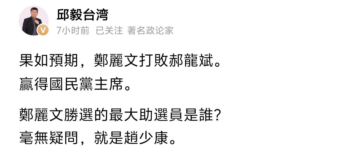 郑丽文打败郝龙斌最大助选员是谁? 答:赵少康。 这是10月18日国民党改选结果出炉后邱毅得出的结论。 缘由赵少康在投票前向民进党“递刀”演绎“引清兵入关”一幕,反而成就了郑丽文的得票数“吊打”郝龙斌。 邱毅的话有一定道理,但不全面。 郑丽文此次胜选,一为她本人口才好,能说会道,二为她有年龄优势,三为她代表了国民党大部分人员的变革愿望,四为部分国民党大佬的站台。 对手的失误是不是为她加分,那是当然;不过只是锦上添花,而非雪中送炭。