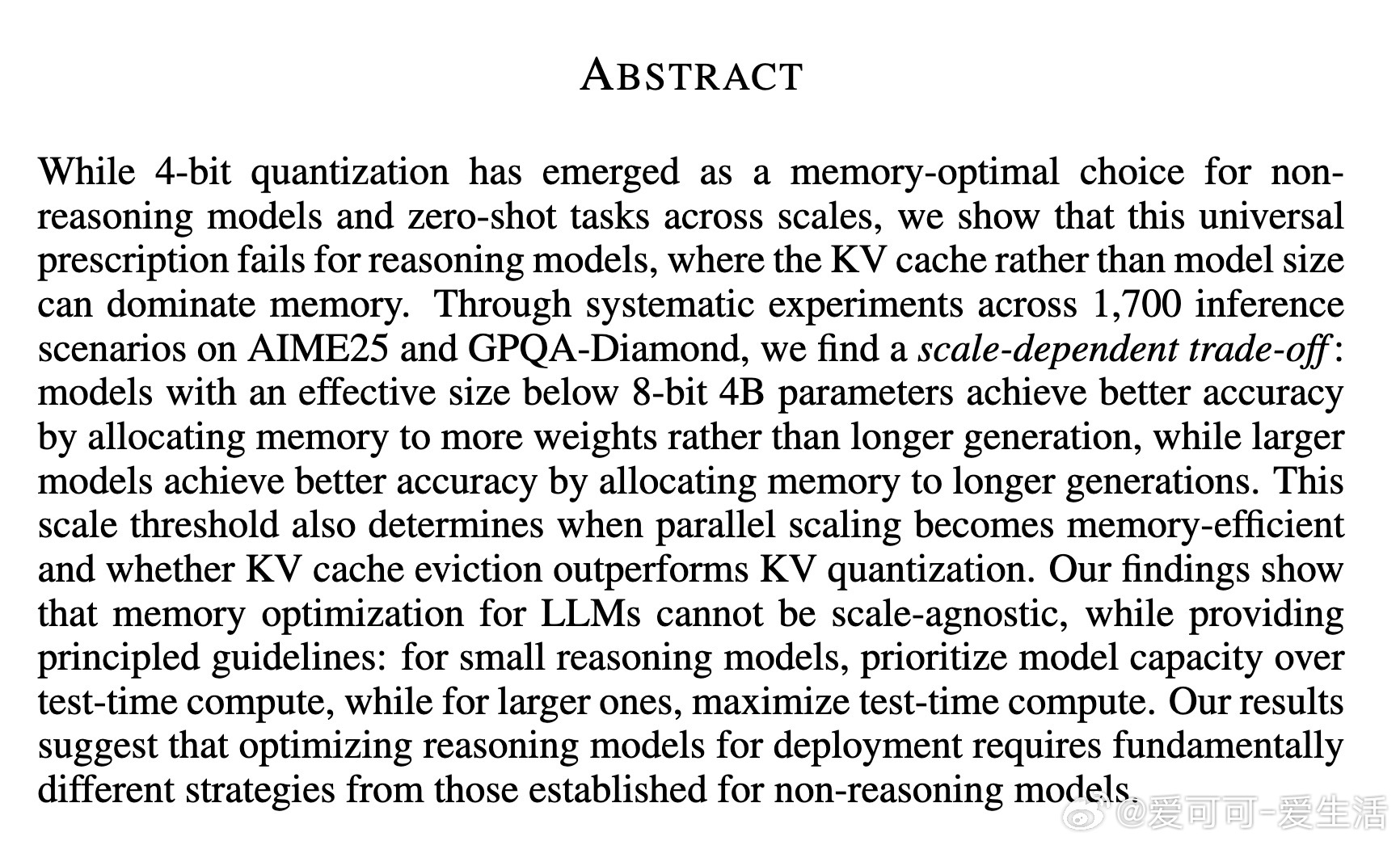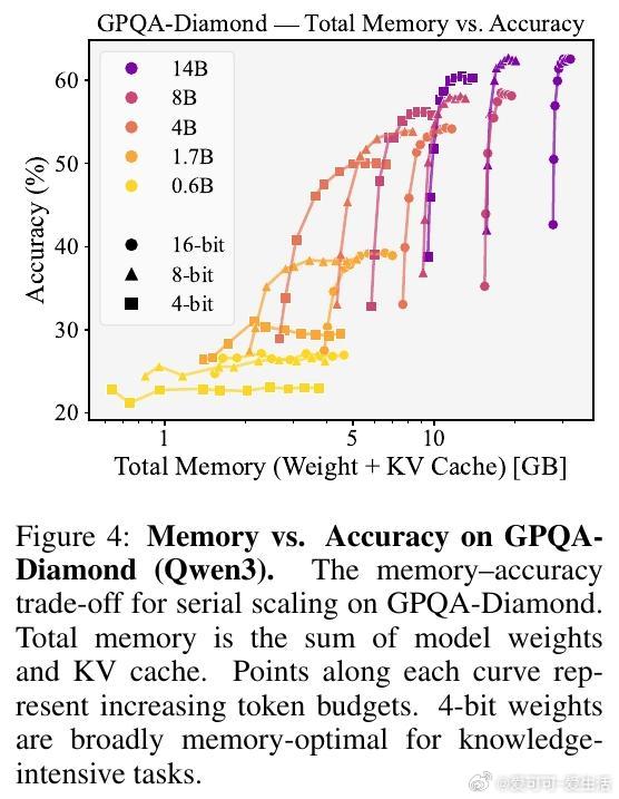 针对推理型大语言模型(LLMs),传统的4-bit权重量化策略未必适用。原因在于推理模型的记忆瓶颈更多来源于KV缓存而非模型权重本身。