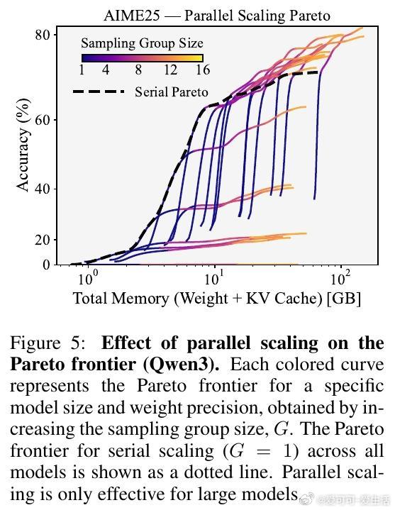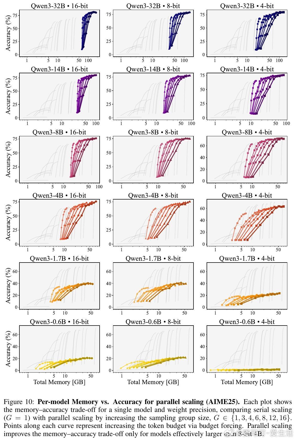 3. 并行扩展(增加采样组大小)只在大模型(≥8-bit 4B)上提升内存-准确率权衡,且最佳组大小随内存预算增长。