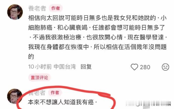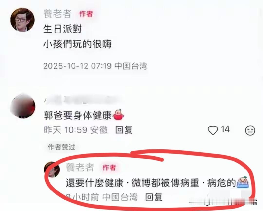 自从被亲家向太在直播当中说最后的日子以后,郭碧婷的爸爸在网上活跃了起来。 直接回复说本来不想让别人知道患癌,还心疼女儿,既要照顾家庭,照顾孩子,还要照顾他。 面对网友身体健康的祝福回复说,还要什么身体健康,微博都被传病重病危了。 感觉向太真的不应该,直接曝光人家的私生活,患癌的人肯定不希望别人知道自己的身体状况。 遇见这样的亲家也是没办法。向太 郭碧婷