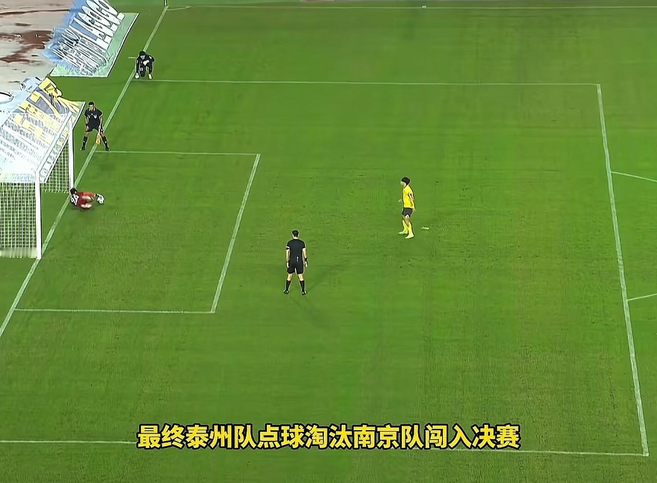 泰州队不愧是黑马,一路逆袭到底。根本没想南京队一开场就来个下马威,16分钟率先进球,泰州队一点不慌,下半场71分钟进球,终于把比分追平,一直咬到点球大战。在这种高压环境下,南京队还是出现了失误,点球踢飞,直接把泰州队送入决赛。该说不说,泰州队球员真是大心脏,同样的环境硬控南京队,决赛见。苏超泰州联赛