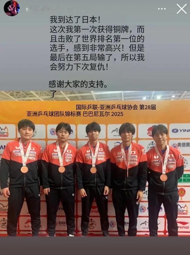 张本智和把队友们带跑偏了,他们的想法如出一辙 亚锦赛已经结束,日本男队获得了铜牌,女队获得了银牌,现如今日本队已经回国。 日本队回国后纷纷接受了媒体采访,他们如出一辙的都有同一个想法,这种想法真的很可怕。 事后张本智和他在媒体上发文: 认为这次亚锦赛的失利非常遗憾,冠军就在眼前没有拿到,自己很失望。他表示在接下来的比赛中自己会变得更强,他要复仇。 日本另一队员松岛辉空表示,这次亚锦赛他第一次获得铜牌,而且击败了排名世界第一的选手,感到非常高兴,但他在第五局输了,他会努力下次复仇的,不出意外他也提出了复仇的计划。 这位初来乍到的18岁的小将走了大运,亚锦赛第二盘直接把世界第一王楚钦给赢了,日本像看到了外星人一样对他崇拜不已。 现在日本队员满脑子复仇计划,体育运动的精神是让大家增加了解,友谊第一。现在日本已经背离了。 张本智和不但自己有复仇的想法,他还把队友也感染上了,复仇已经深深的印在他们到心里,有这种想法很危险,体育运动是竞技运动,凭本事争胜负,没这个实力就不要玩,满世界的复仇不可取。 张本智和和他的队友是全世界独一无二,真没听到国际上其他队员整天口口声声的要复仇,即使输了也是从自身找原因,努力改进提高技能水平。现在张本智和的复仇思想已经在日本体育队伍中蔓延,真不是好事情。 张本智和表情包 张本智和父亲 张本智 张本智和恋情 世乒联冠日本站 日本乒乓球梯队 张本智和同人文