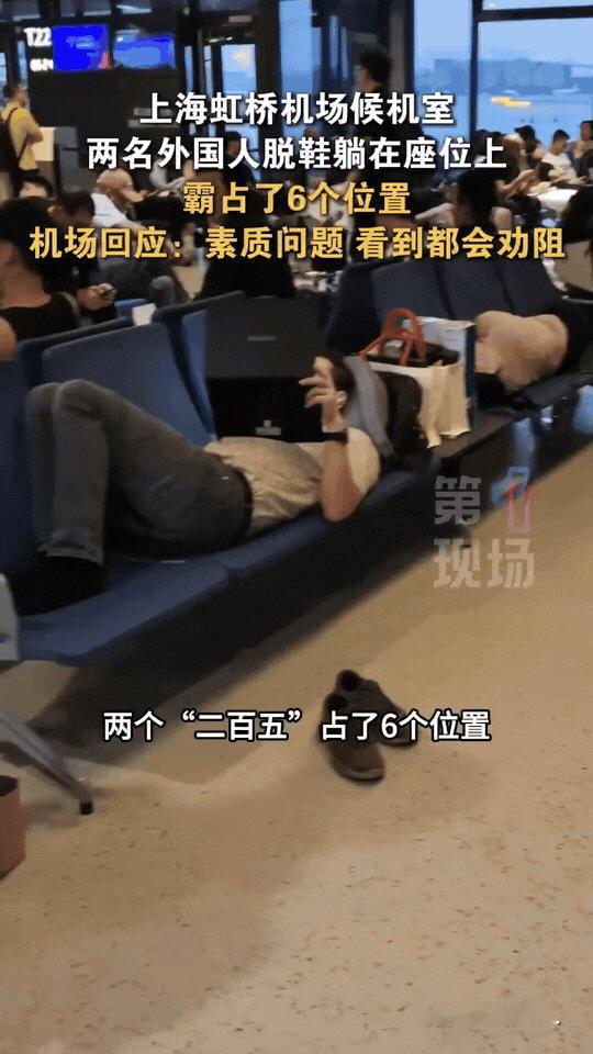 “等素质提高了再来中国”!近日,上海一国际机场内惊现一处“躺平区”,但此躺平非彼躺平,两个外籍男子把鞋脱了,又将行李摆在座椅一侧,然后躺在座椅上睡觉,直接占了六个座位。 现场视频显示,两名外籍旅客脱鞋躺卧在候机座椅上,一人占据三个座位,两人共占用了六个公共席位,而旁边不少旅客只能站着等待座位。有乘客上前劝阻,但未获回应。 事件引发网络热议,网友们对此看法不一,有人怒斥这种行为缺乏素质,也有网友理性指出素质问题不分国籍,不能仅仅因为是外籍人士就过度关注。 上海虹桥机场工作人员回应称,此类行为属于旅客个人素质问题,现场工作人员发现后会及时劝阻,机场秉持“众生平等”原则,不会因旅客外籍身份给予特殊对待,并将通过加强巡逻维护候机秩序。