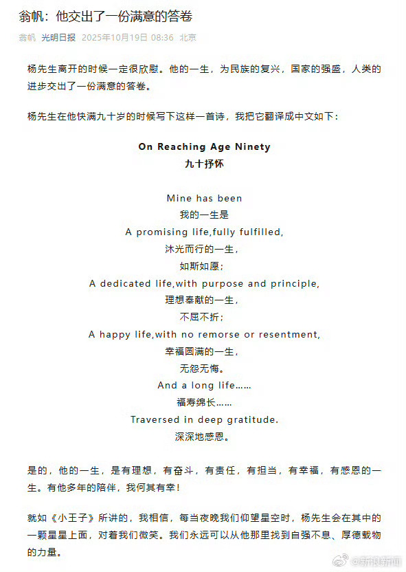 【#翁帆发文#】#翁帆说杨振宁交出了满意答卷#翁帆在《光明日报》撰文:杨先生离开
