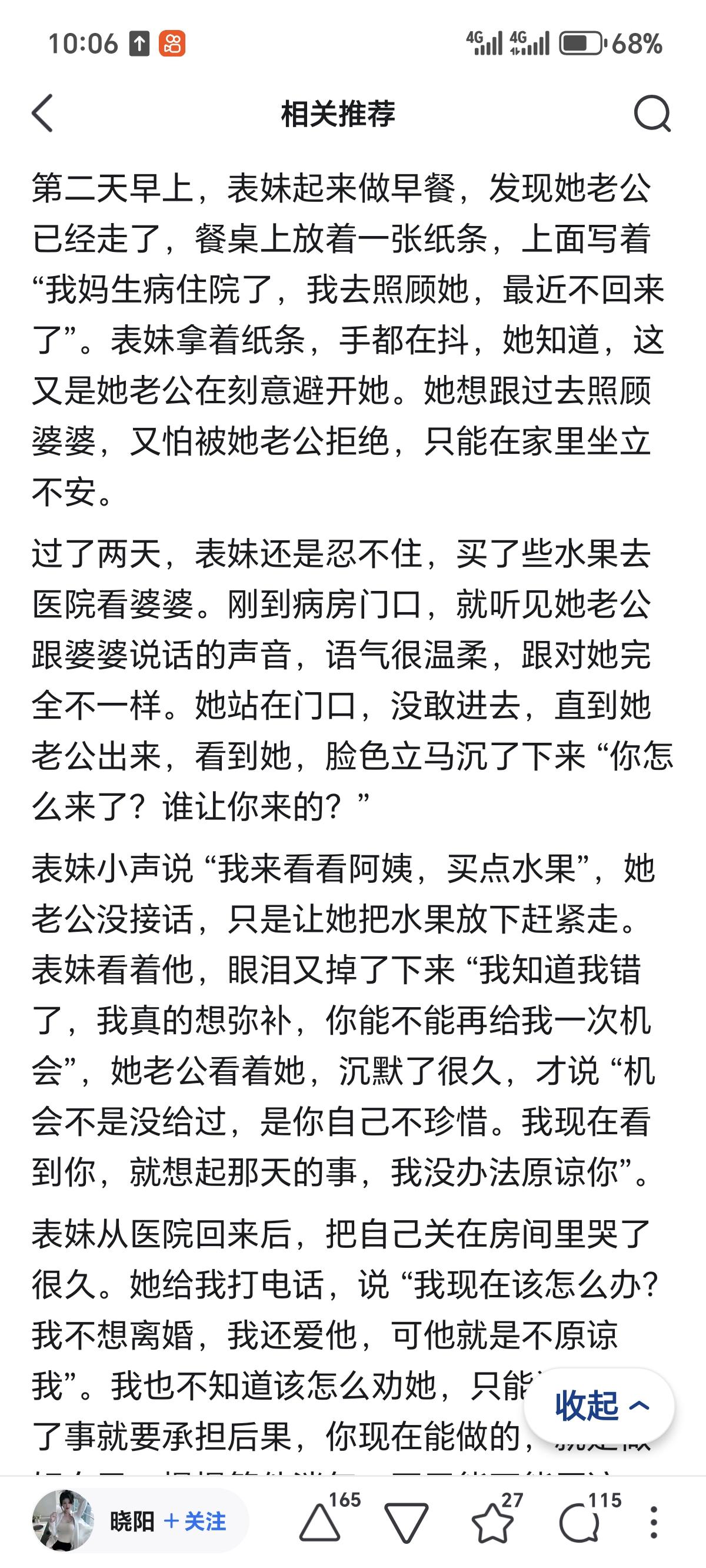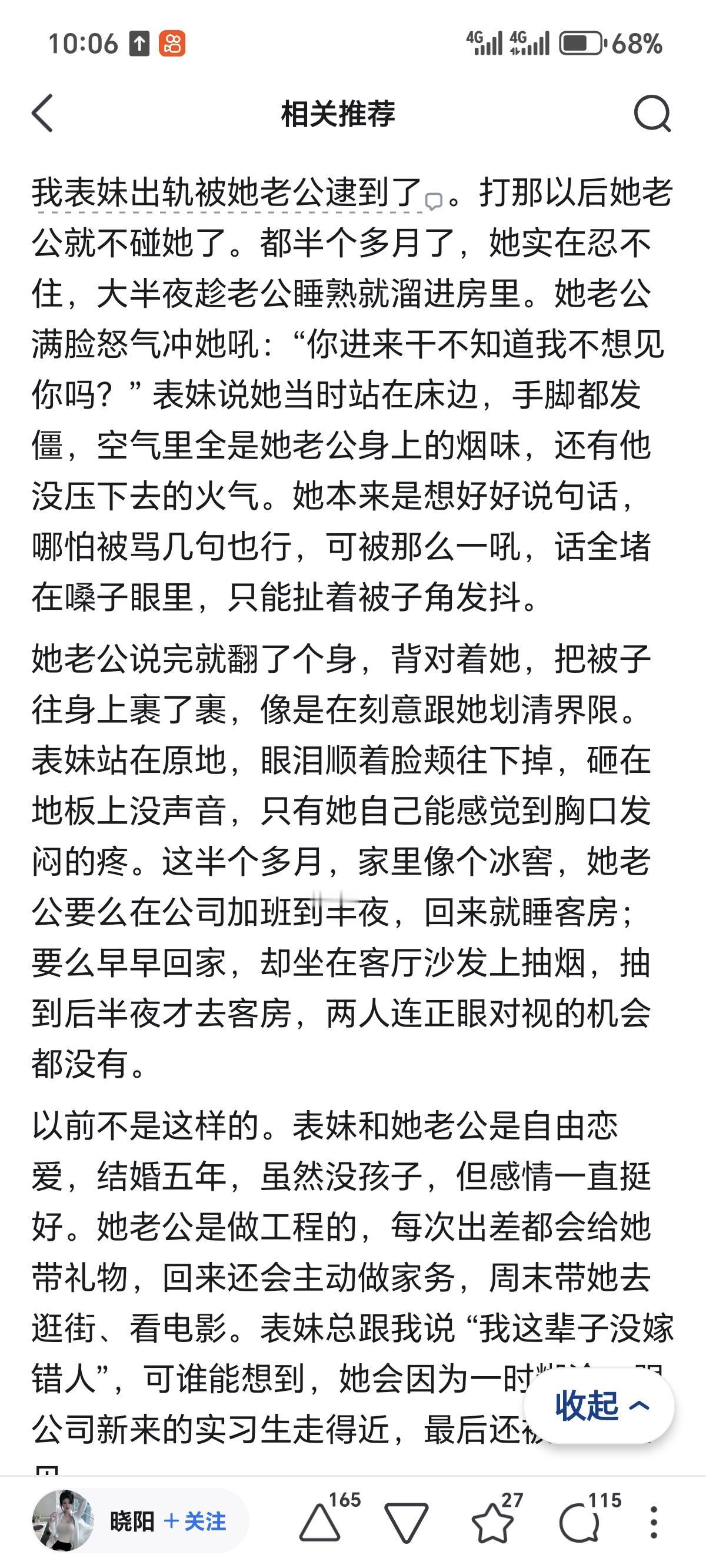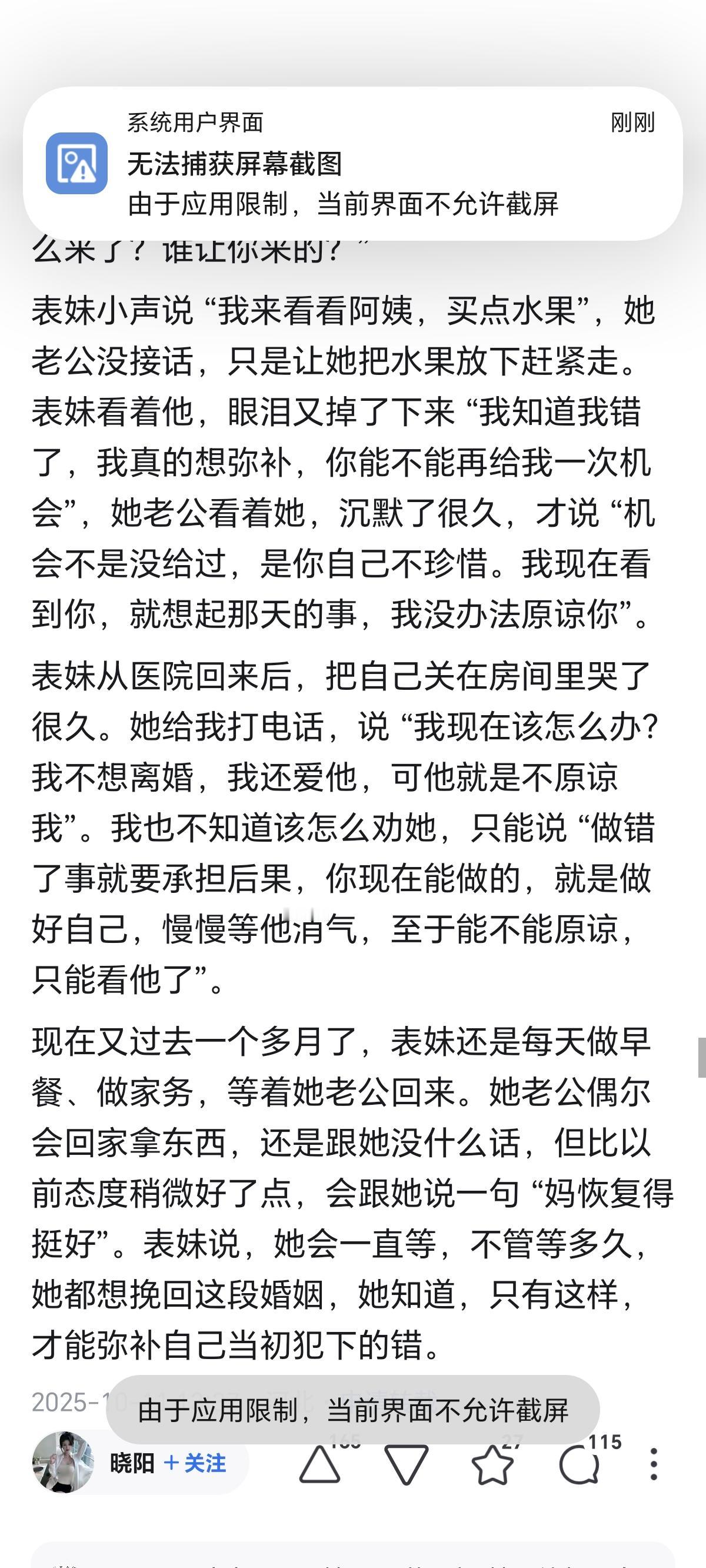 我表妹出轨被她老公逮到了。打那以后她老公就不碰她了。都半个多月了,她实在忍不住,大半夜趁老公睡熟就溜进房里。她老公满脸怒气冲她吼:“你进来干不知道我不想见你吗?” 表妹说她当时站在床边,手脚都发僵,空气里全是她老公身上的烟味,还有他没压下去的火气。她本来是想好好说句话,哪怕被骂几句也行,可被那么一吼,话全堵在嗓子眼里,只能扯着被子角发抖。那天出事之后,她老公没打她,也没骂她,只是平静地说 “你想怎么办”。表妹当时慌了,哭着说 “我错了,我再也不敢了,你原谅我好不好”。她老公没说话,当天就搬到了客房,从那以后,就再也没跟她有过任何亲密接触,连说话都少得可怜。 相关调查显示,68%的婚姻出轨事件后,受害者会选择冷暴力而非激烈冲突,这种沉默本质是信任崩塌后的自我保护。表妹老公的烟味和怒火,藏着的是被背叛后的屈辱,半个多月的疏离已经让情感裂痕逐渐固化。 婚姻咨询数据表明,出轨后仅靠口头道歉修复关系的成功率不足25%,没有实际行动支撑的“再也不敢”,在受害者眼里只是苍白的敷衍。表妹的发抖和无措,没能抵消老公对婚姻忠诚的失望。 冷暴力不是解决矛盾的方式,却精准折射出出轨对婚姻的毁灭性打击。背叛打破的不仅是亲密,更是彼此相处的安全感,若只停留在道歉而不做长期的信任重建,这段关系要么在沉默中走向终结,要么在勉强维系中充满煎熬,过错方必须正视伤害,而非仅纠结于自身的孤独。出轨 婚姻内出轨 伴侣出轨 出轨女人 对象出轨 女性出轨 女子出轨