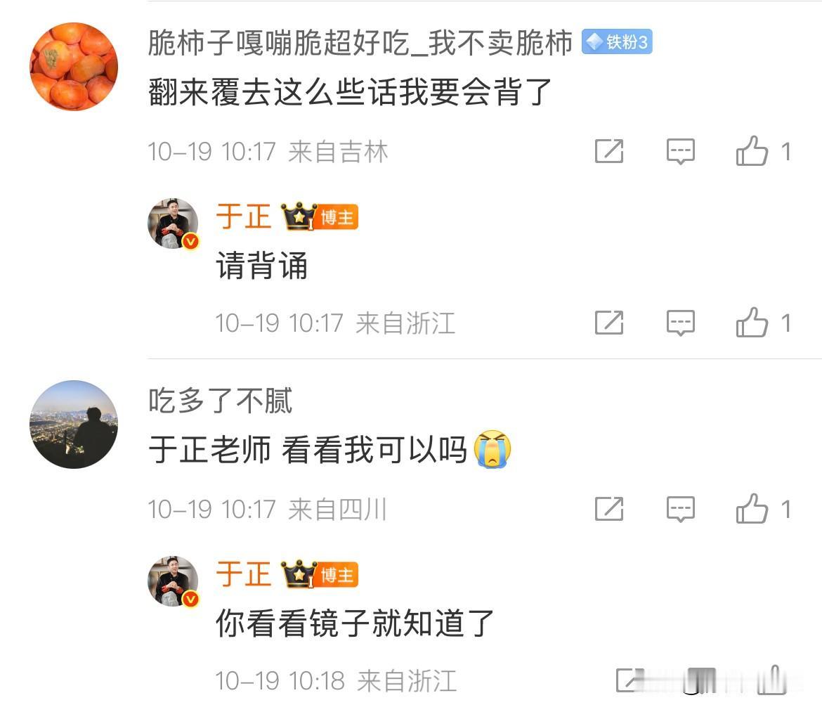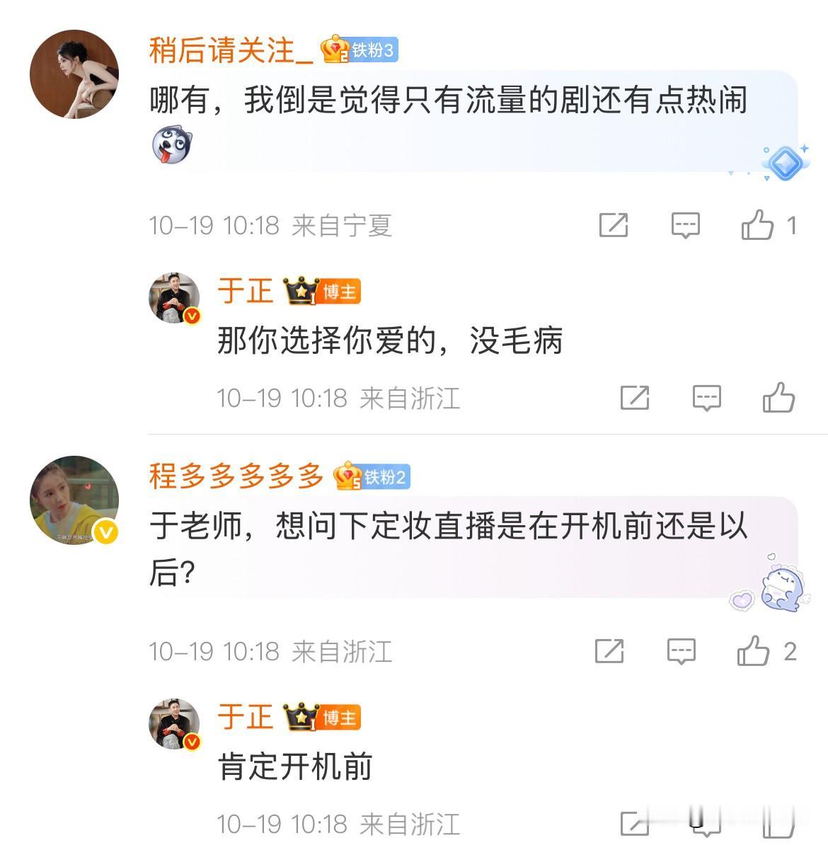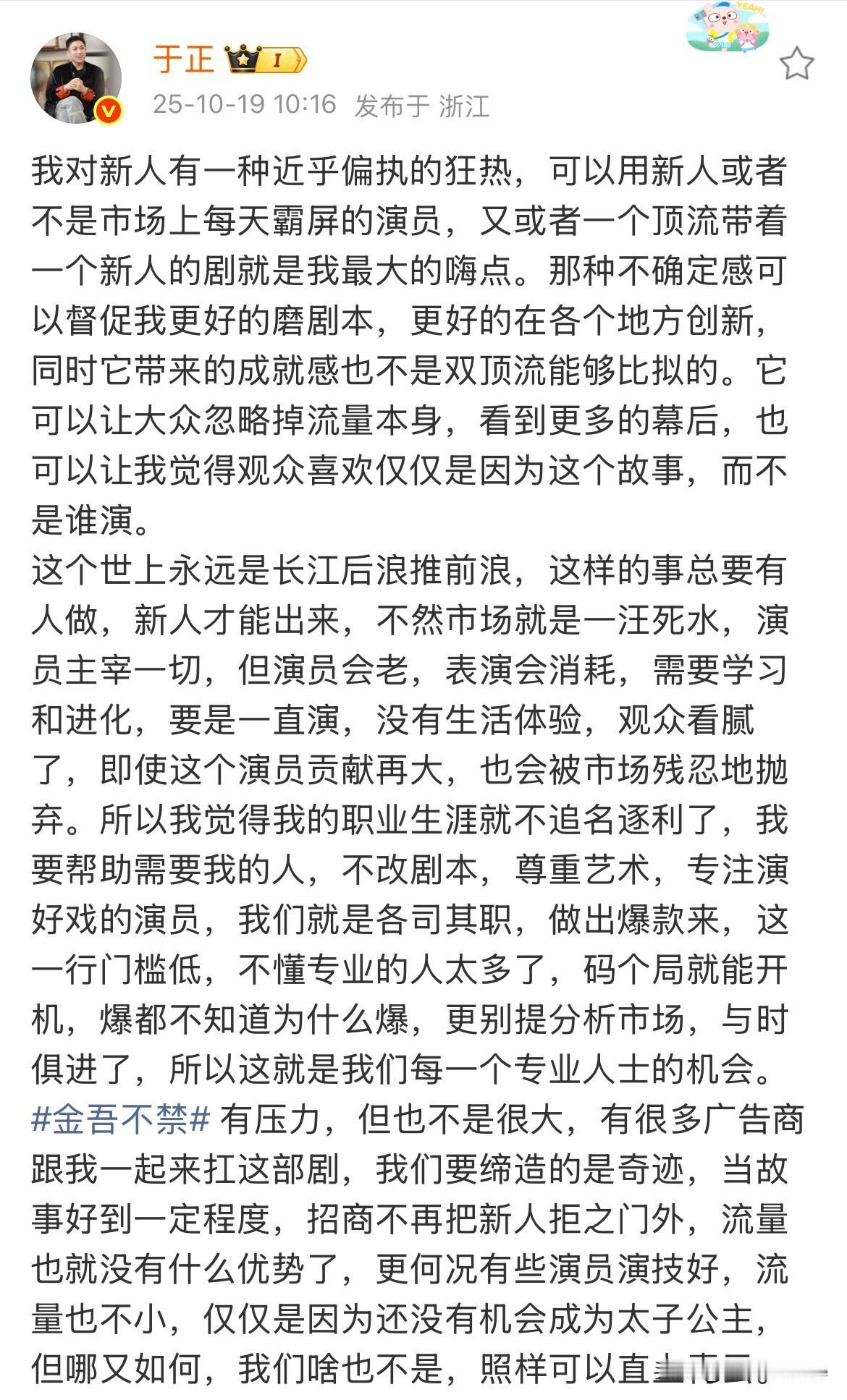10月19日,于正不给观众洗脑了,开始给广告商洗脑,第一次见一部剧,男女主不抗剧,出品方老板拉着广告商扛剧的[捂脸] 于正真是流量不够,花钱来凑,为了捧赵晴,拿自己当鱼竿,又是钓观众,又是钓广告商,天天写小作文画大饼,观众网友吃腻了不买账,他就转头忽悠广告商,说要跟他们创造奇迹,逗笑了不少看客! 这样也挺好的,于正用事实证明,内娱影视圈哪有什么严格的审核,一切不过是甲方的一句话而已,哪有什么爆剧,不过是技术敲几下键盘的事而已……
