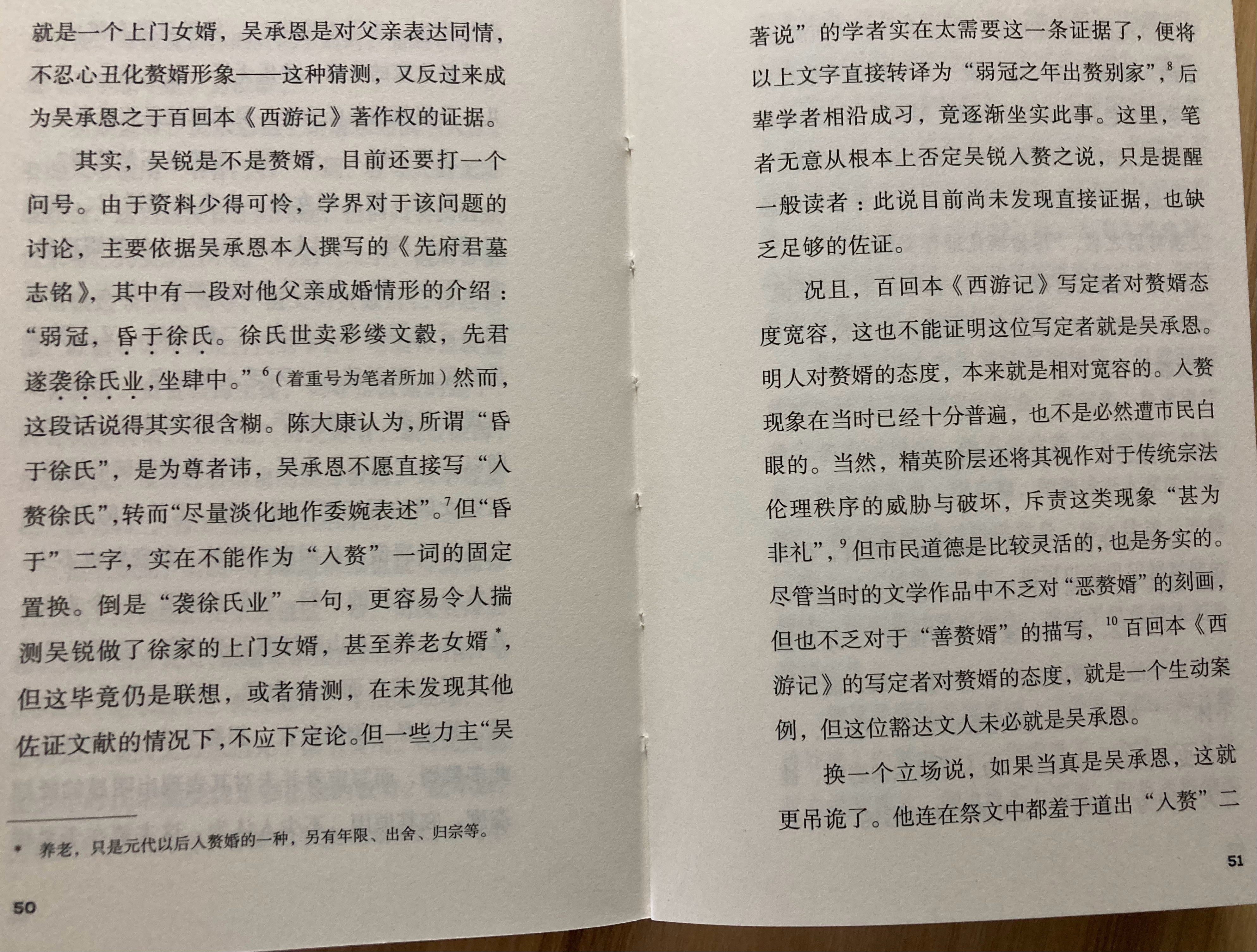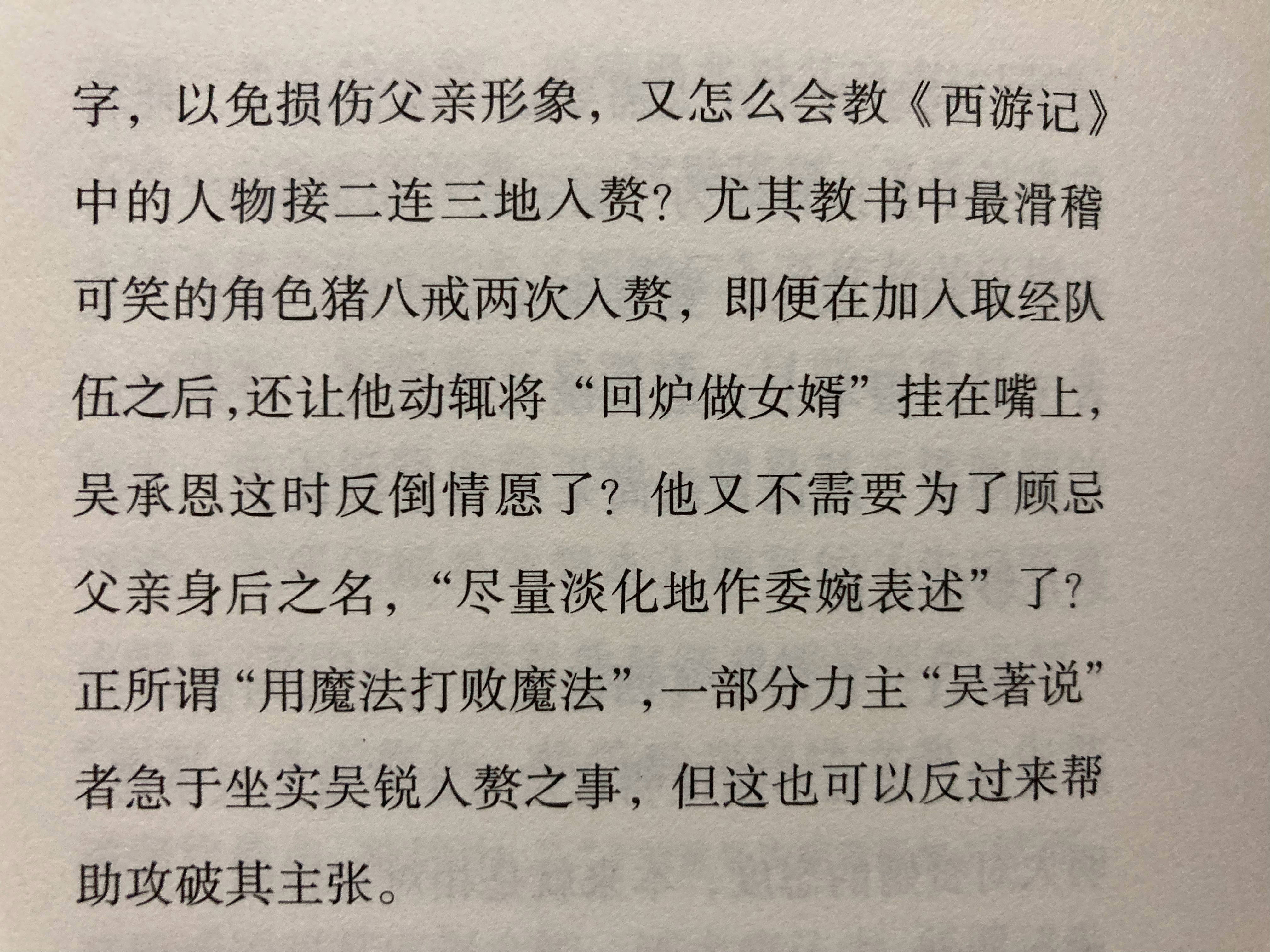 “吴著西游”的主张者先是通过吴承恩为其父吴锐撰写的墓志铭推断吴锐为赘婿,再以《西游记》中赘婿频见为由,佐证吴承恩为百回本写定人,这一论证链其实颇有瑕疵(《花窗三十看“西游”》)