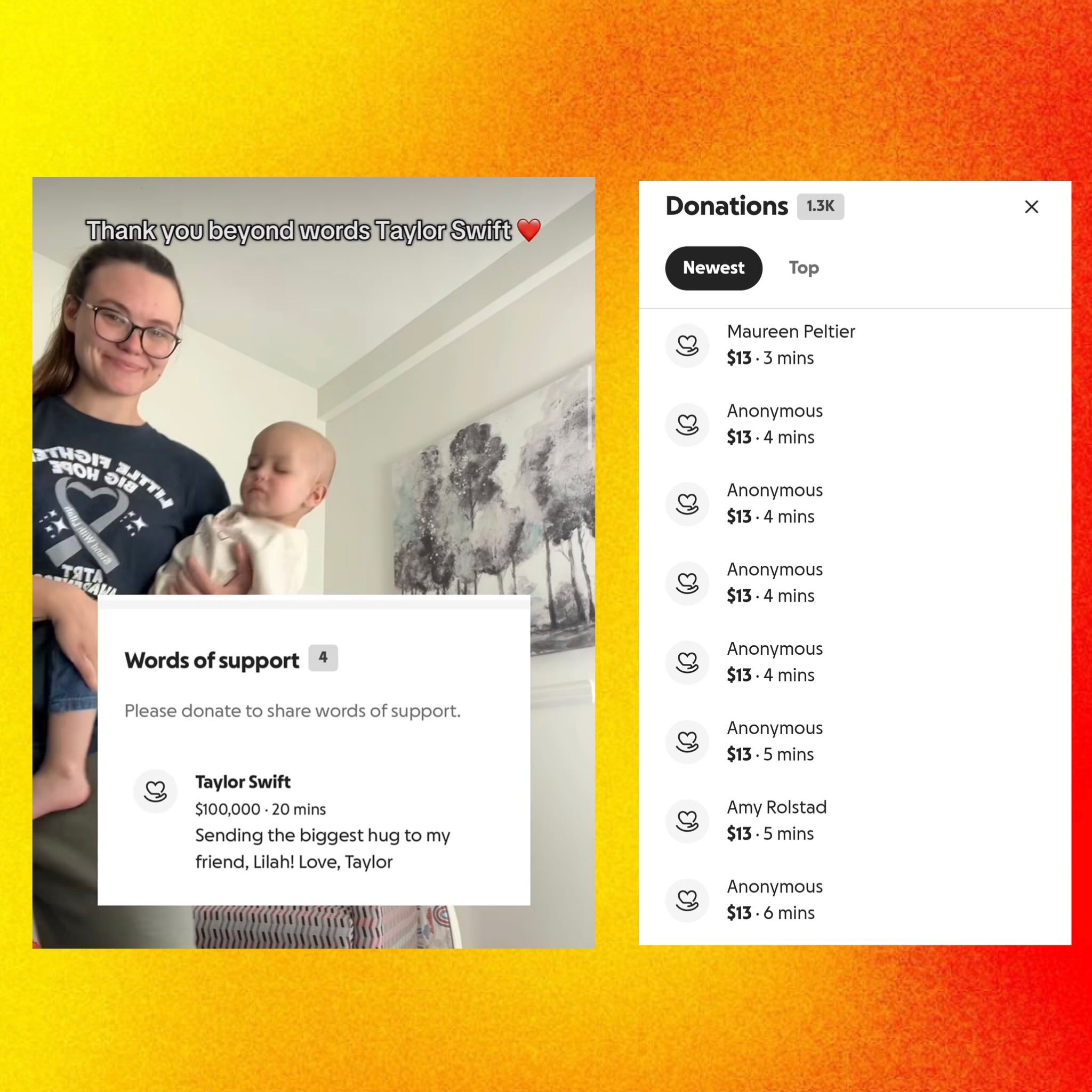 泰勒·斯威夫特 (Taylor Swift) 给一位抗击癌症的小女孩捐赠了 10 万美元,随后粉丝们也开始每人捐赠 13 美元以表示支持。