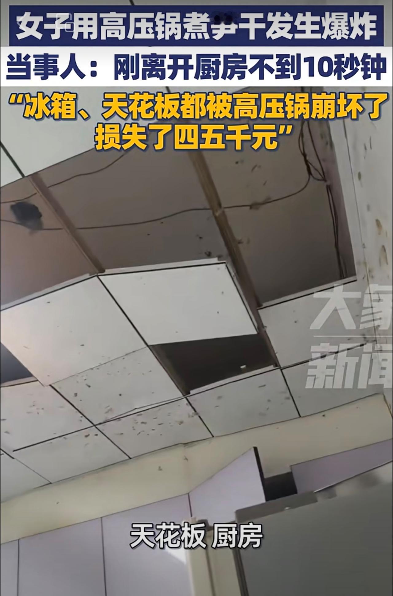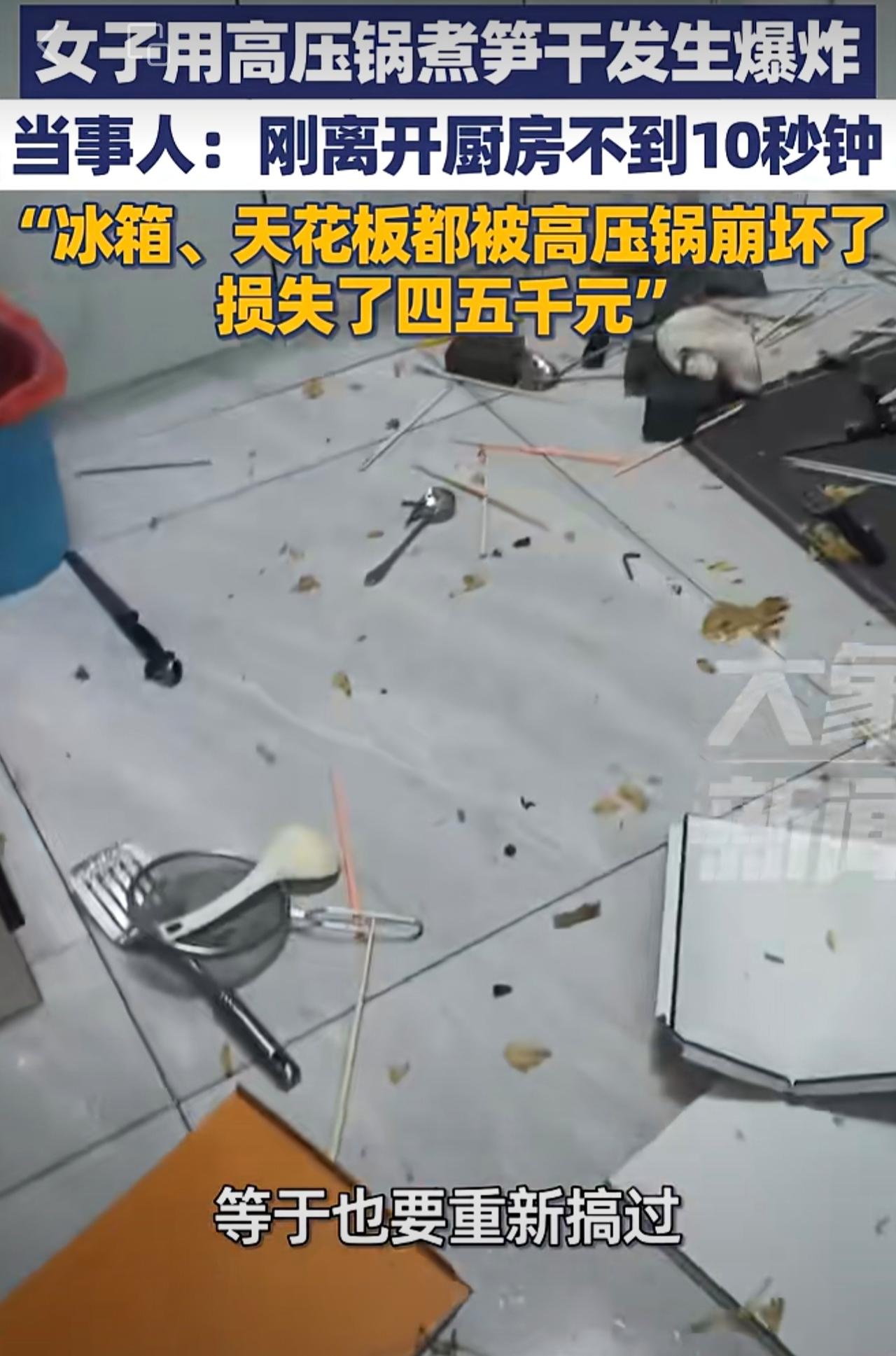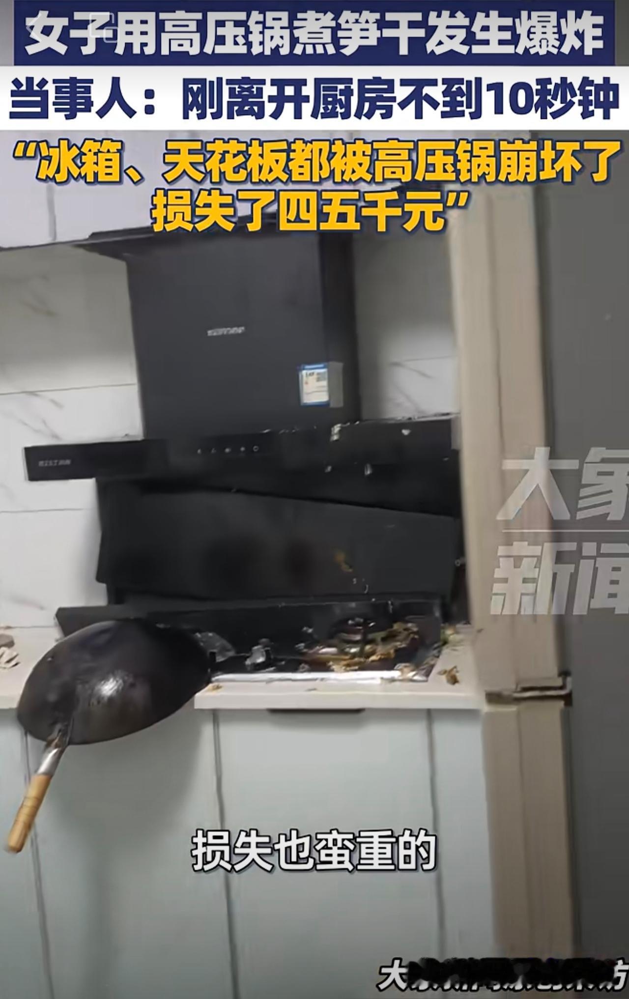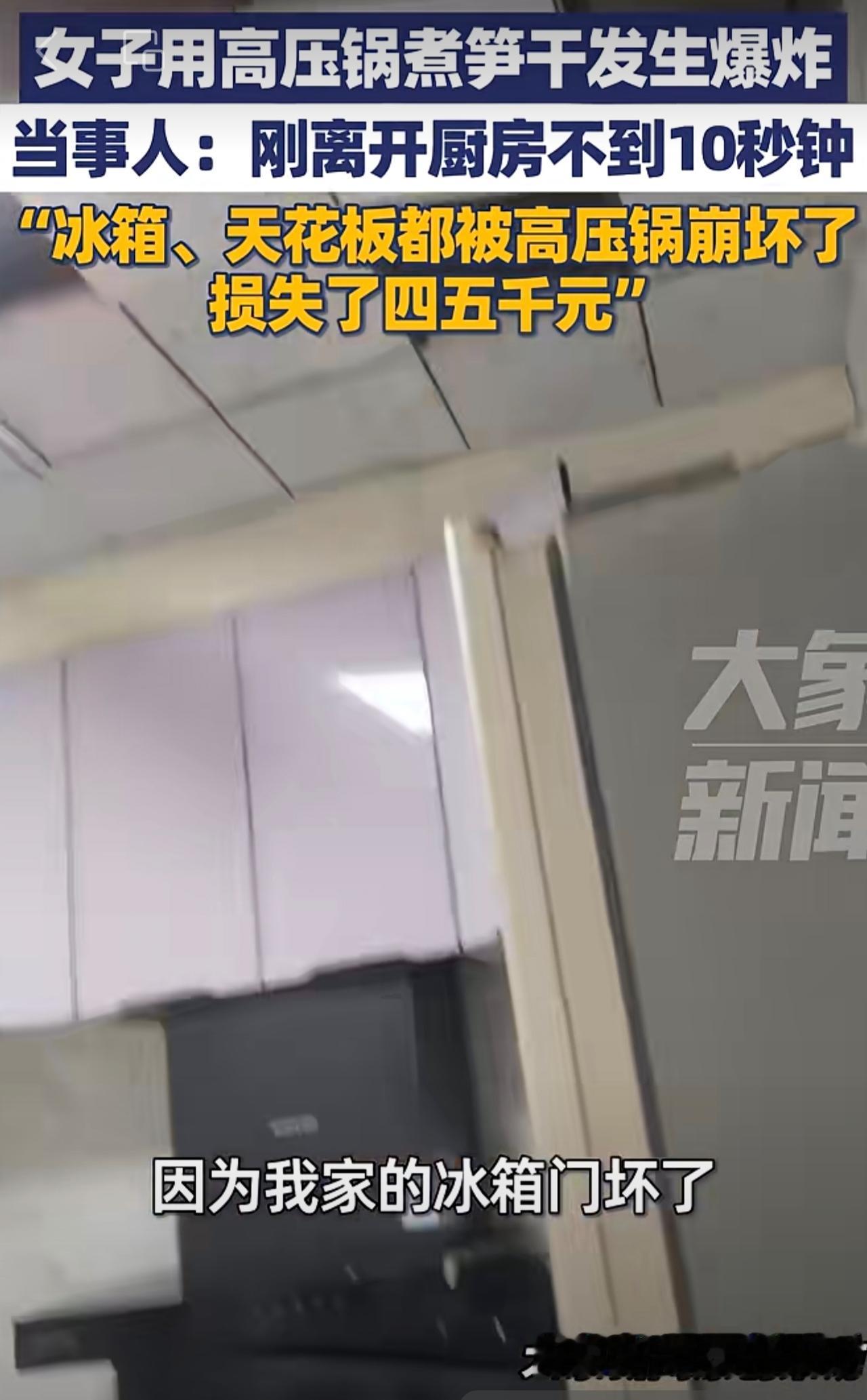 女子用高压锅煮笋干发生爆炸,当事人:刚离开厨房不到10秒钟,冰箱和天花板都被高压锅崩坏了,损失四五千元[捂脸]