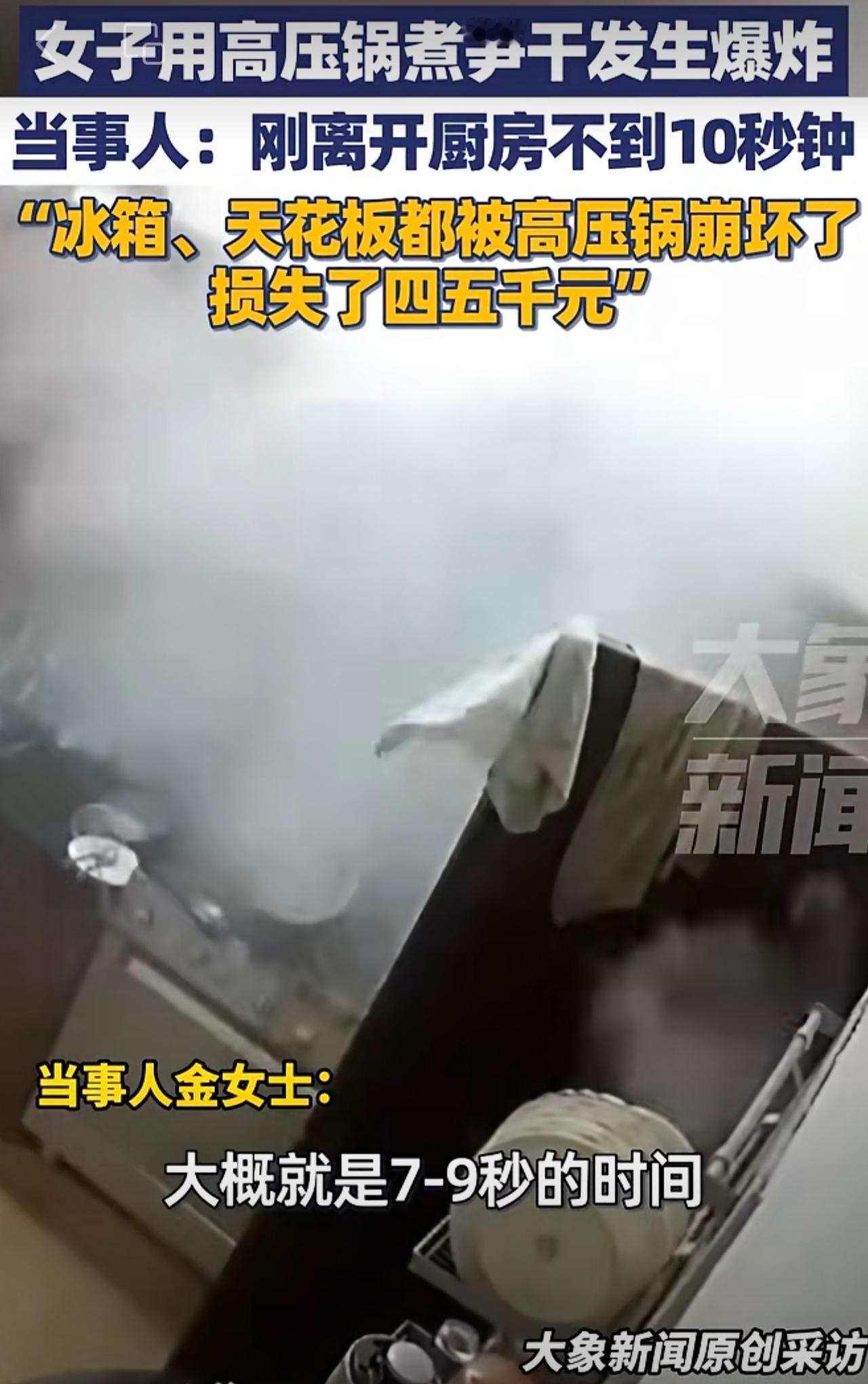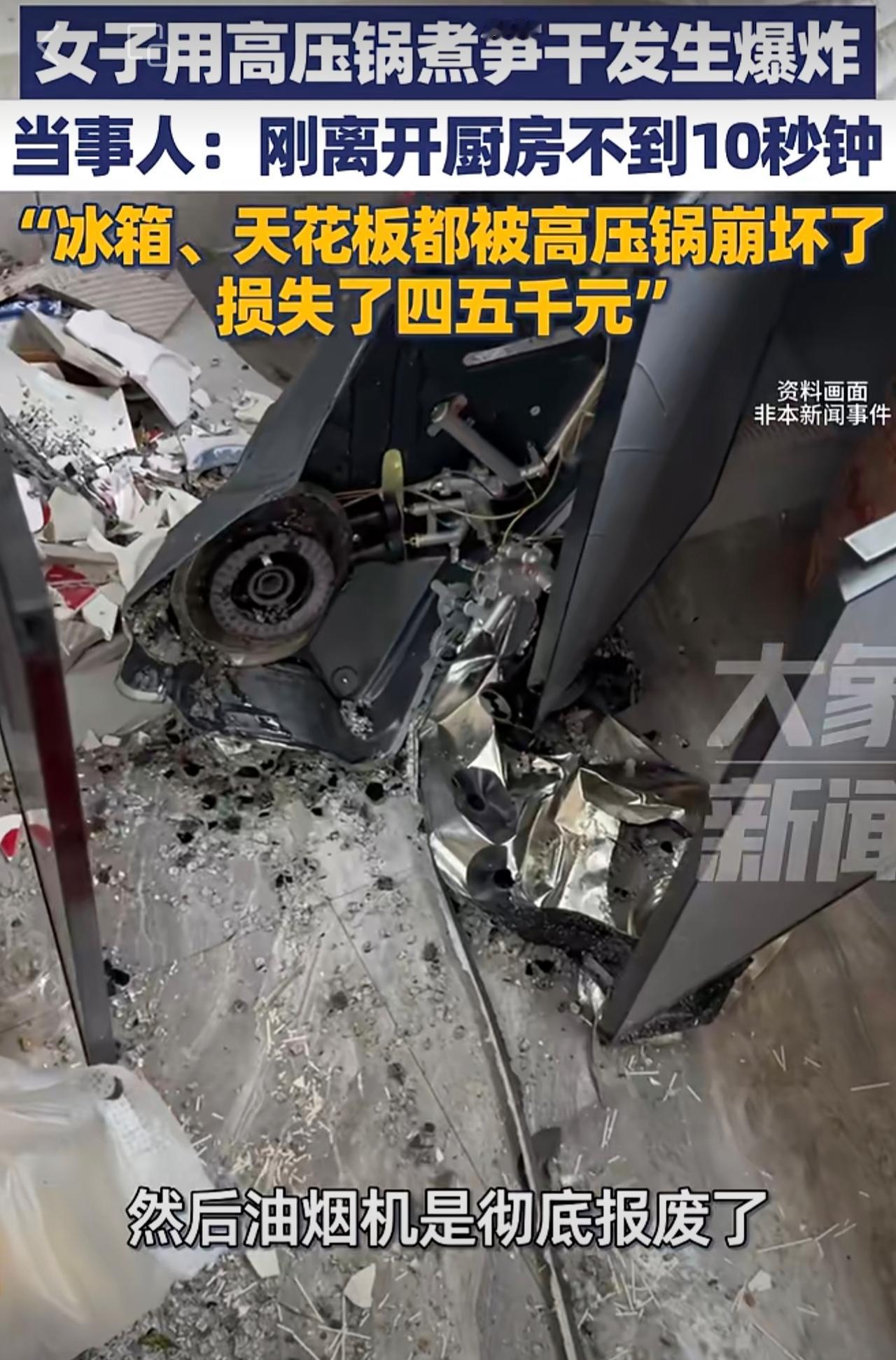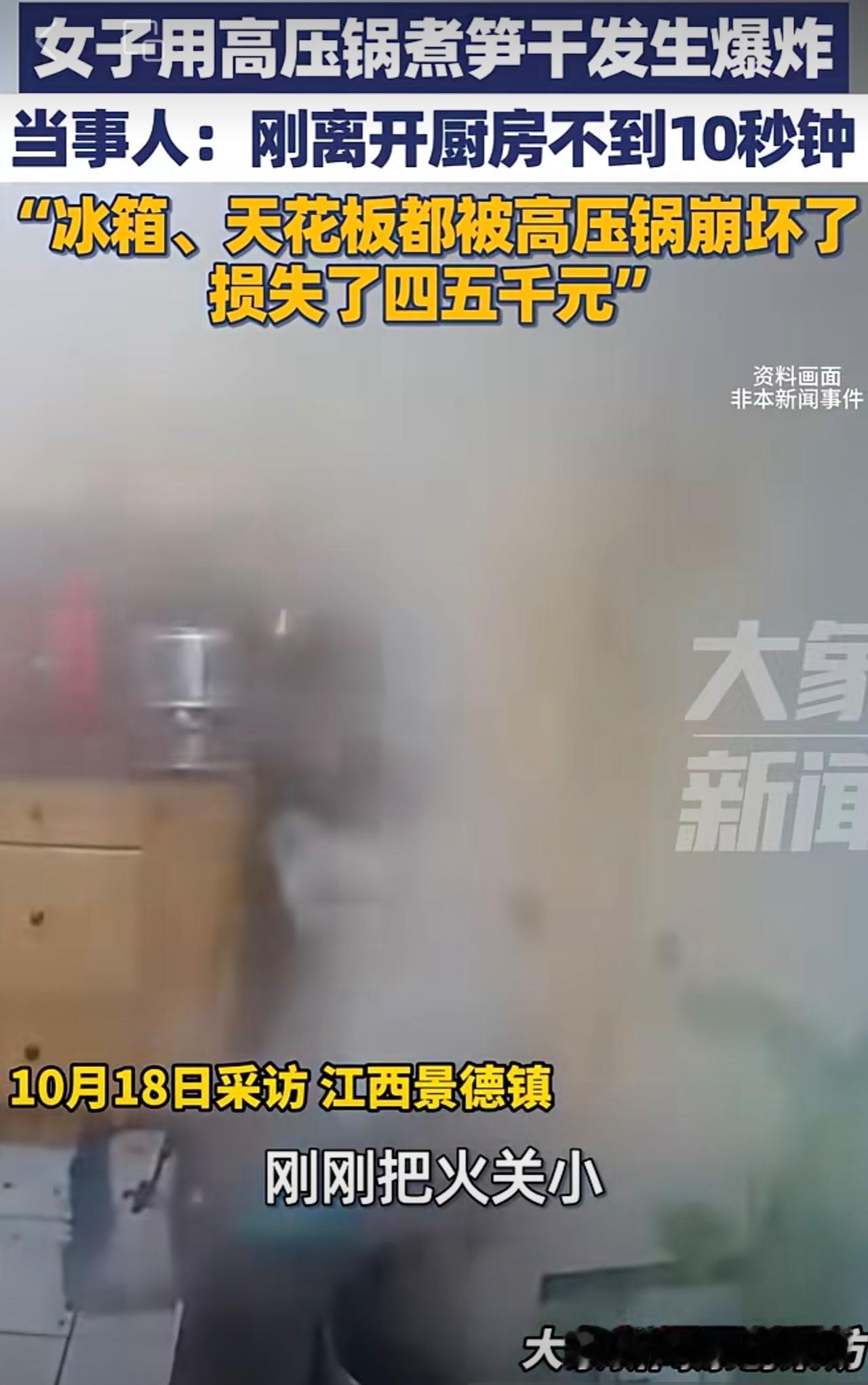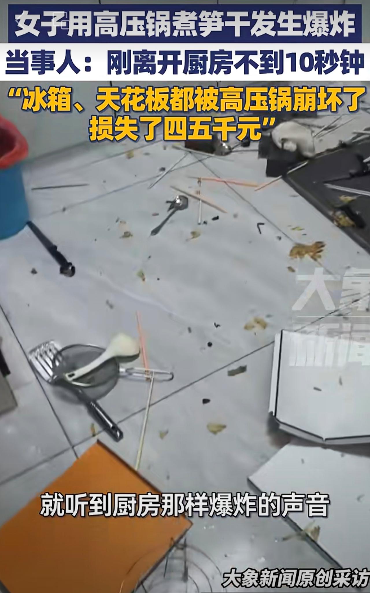 女子用高压锅煮笋干发生爆炸,当事人:刚离开厨房不到10秒钟,冰箱和天花板都被高压锅崩坏了,损失四五千元[捂脸]