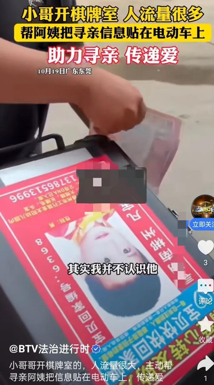 不是大善才动人,棋牌室老板这波操作,比啥都暖! 谁规定做好事得轰轰烈烈啊?北京这位开棋牌室的小哥哥,没捐钱也没捐物,就做了件“小事”,却让人心里发暖。他知道自己店里人流量大,主动帮寻亲阿姨把寻亲信息贴在电动车上,就这么一个简单动作,却给走失者的家庭多递了份希望。 其实生活里哪有那么多“超级英雄”,更多的是这样藏在细节里的善意。不像那些摆拍作秀的,他做的事不用花多少力气,却刚好戳中人心——毕竟寻亲最难的就是让信息传得更远,他这随手一贴,就是在帮着接力传递爱。 我总觉得,真正的善意从不是喊口号,而是看见别人的难,顺手搭个手。你们平时有没有遇到过这种“小事见大暖”的人?当时有没有被戳到的瞬间呀?