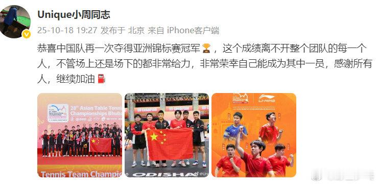 周启豪发博总结亚锦赛 周启豪发博分享2025亚锦赛男团夺冠喜悦,直言荣幸成为团队一员,感谢所有人的付出。