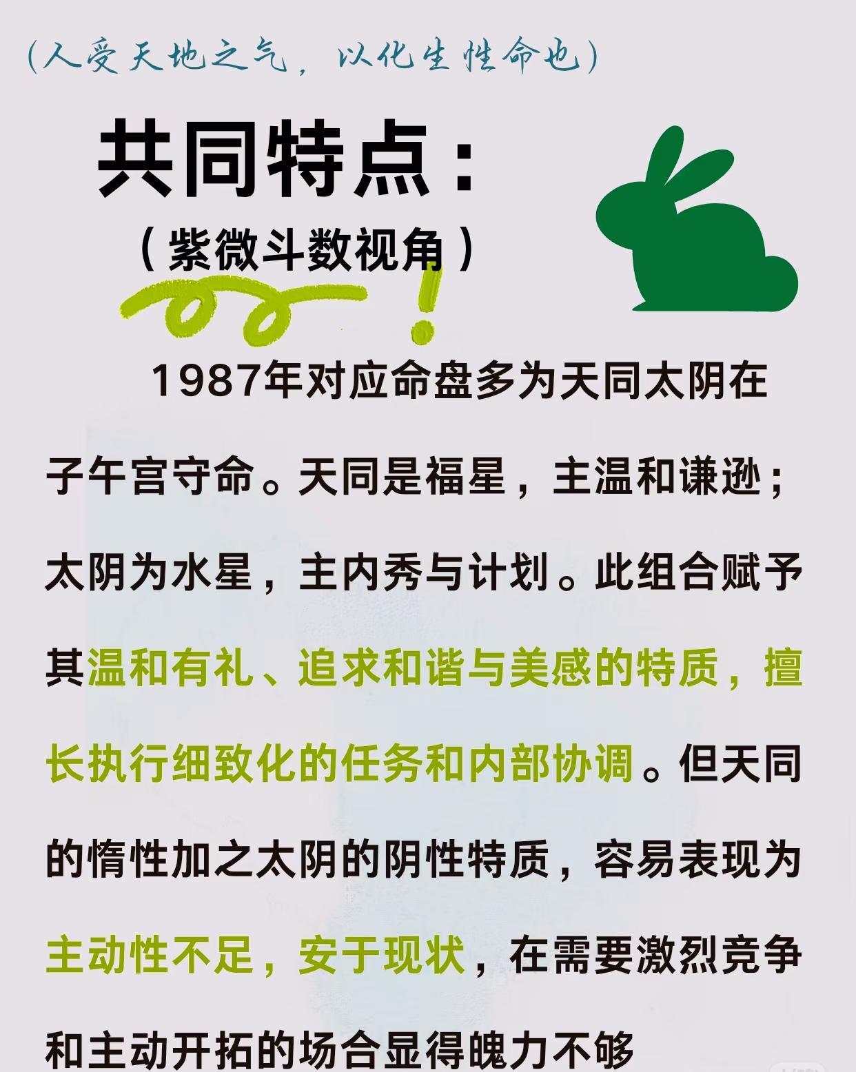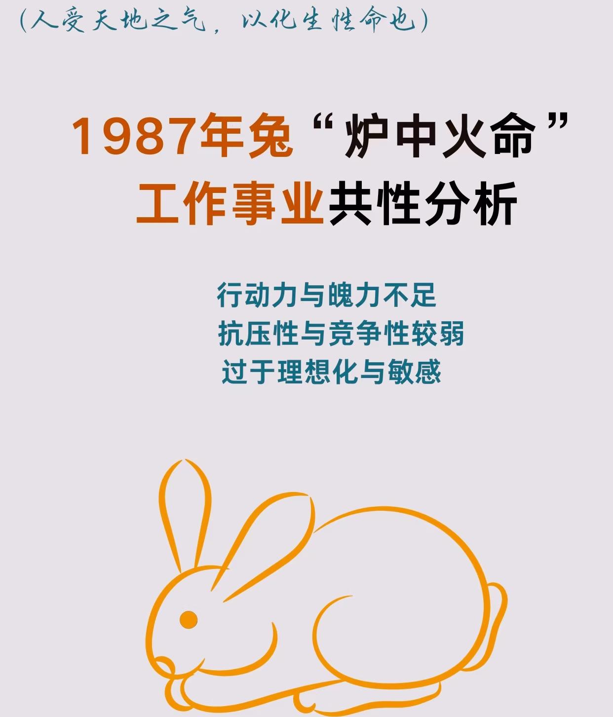 1987属相是兔的命运几何?走上坡路 抗了6年的低谷期,终于要彻底翻篇了! 窑火三日,方成传世之器;风雨十载,始见玉兔东升。 月涵云海,终耀星河” 但行好事,莫问前程。 健康是本,其余是末”, 照顾好身体,才有底气奔赴下一程。 命里有时终须有,命里无时莫强求 烛火虽微能照夜,柔兔亦有坚守心。 命里一尺中庭白玉尘 莫求一丈红蔷拥翠筠 待得风停尘定后,暖光长照福门深。 云开月现,辉光自成,唯善守其静者,终得遍照之明。 。